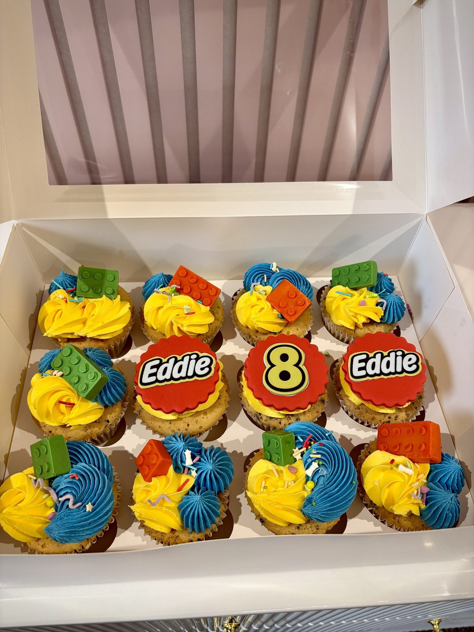 A bright and playful collection of Lego-inspired cupcakes, designed to bring colour and fun to any birthday celebration. Finished in bold yellow and blue buttercream swirls, each cupcake is decorated with vibrant chocolate Lego bricks and colourful sprinkles for a lively, energetic look. A central fondant topper can be customised with any name and age, making this set perfect for birthdays of all numbers. Fun, eye-catching and full of personality, these cupcakes are ideal for children’s parties and creative, activity-filled celebrations.