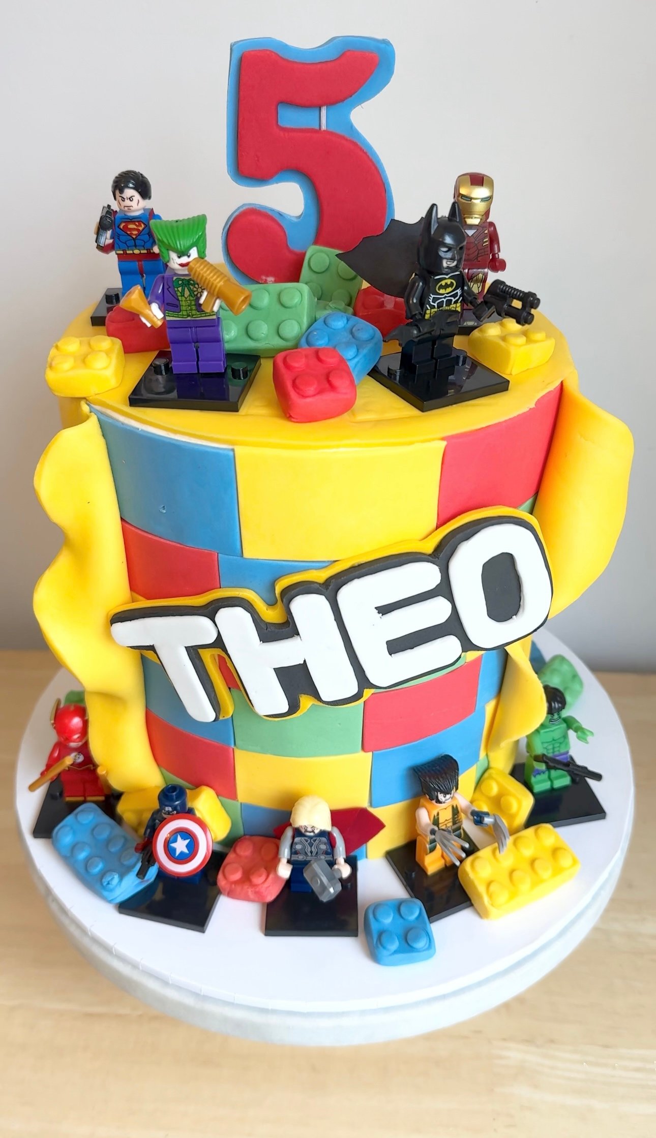 Bring the ultimate superhero adventure to life with our Lego Superhero Cake! Designed with a colourful brick pattern, this cake is decorated with edible building blocks and features an exciting fondant effect that appears to peel away, revealing the action-packed world beneath. Topped with iconic superhero mini-figures, this cake is perfect for any fan of comic book heroes and building block fun!