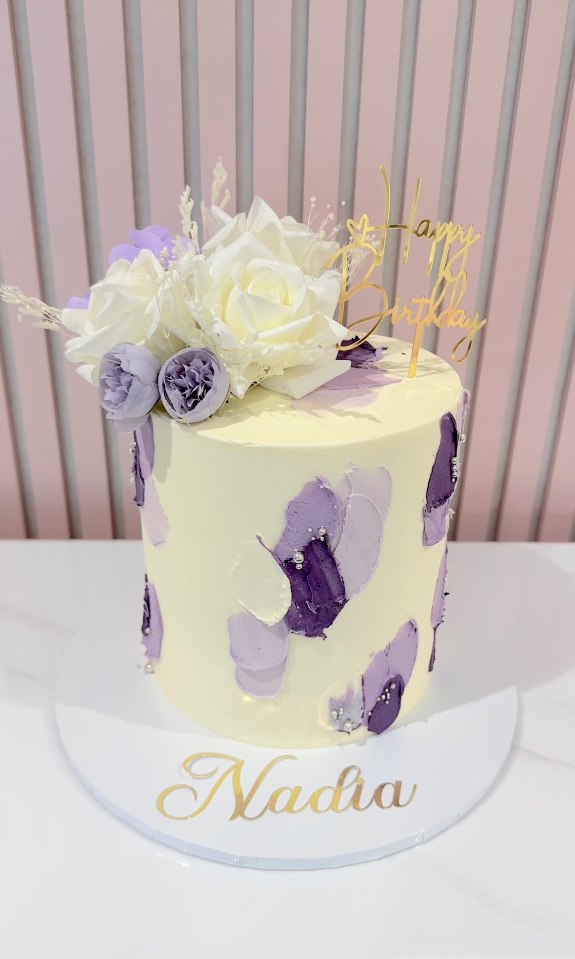Celebrate in style with this elegant lilac-themed birthday cake, finished with textured buttercream swatches in soft violet tones and adorned with shimmering silver pearls. The top is crowned with a striking arrangement of artificial white and lilac flowers for a luxurious touch. A beautifully feminine and sophisticated design that’s perfect for birthdays of all ages.