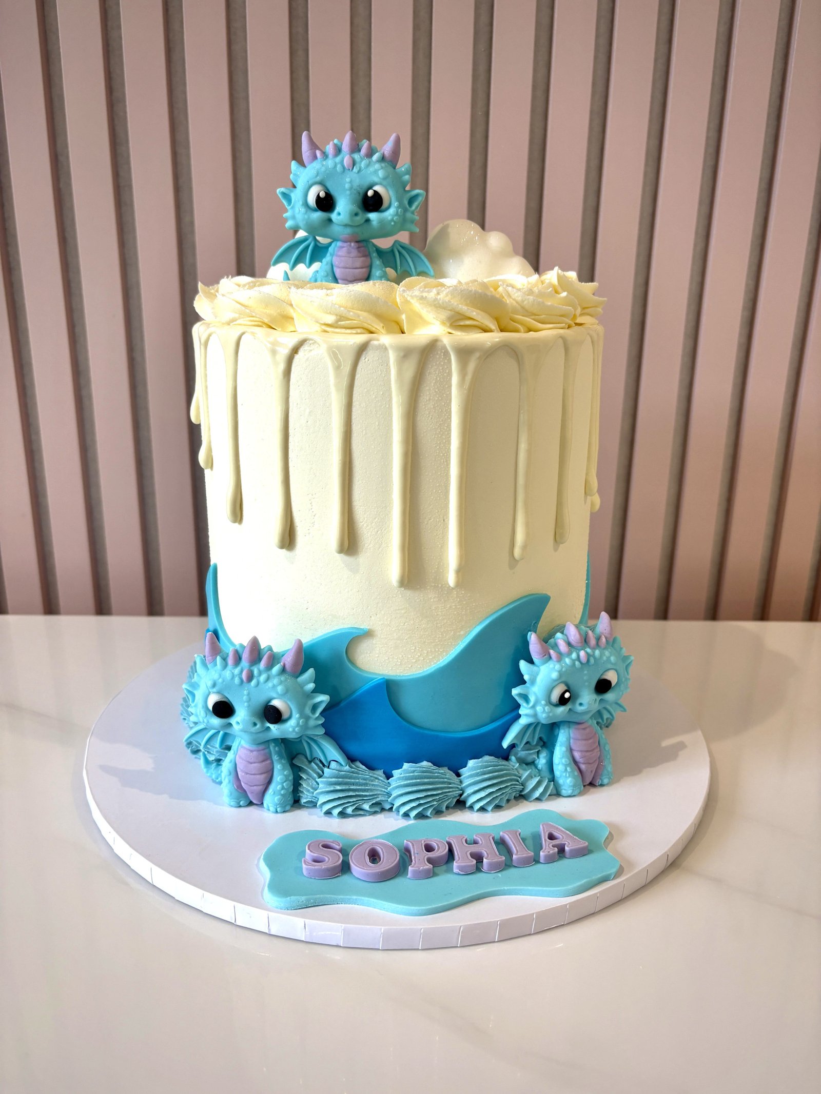 The Little Dragon Drip Cake is a magical birthday design finished in smooth ivory buttercream with a white chocolate drip, handcrafted baby dragon figures in soft blue and lilac tones, and flowing wave details around the base. Playful yet beautifully refined, this tall cake creates a striking centrepiece for any little dragon lover’s special day.