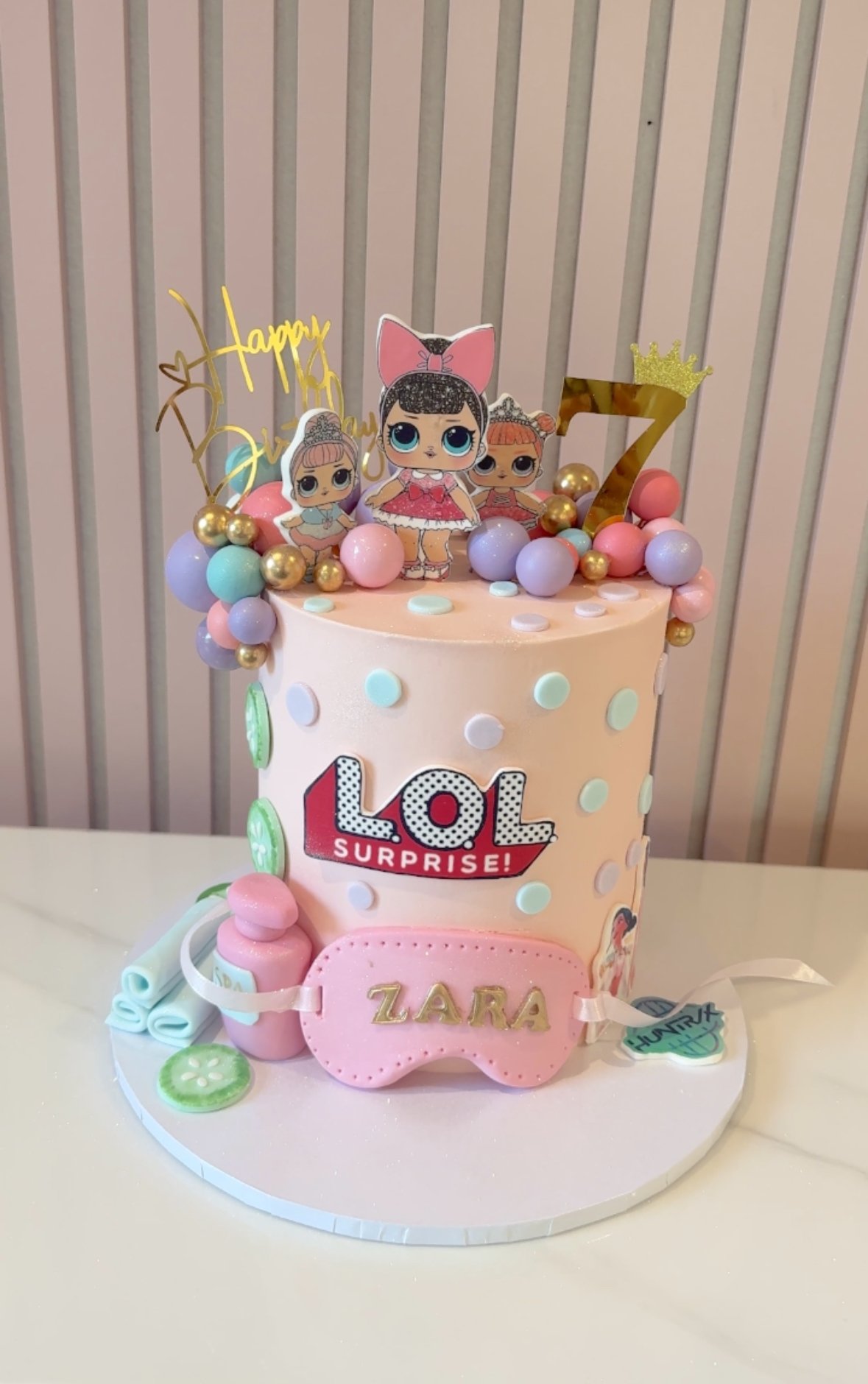 Bursting with personality and cuteness, this LOL Surprise-inspired cake is perfect for any fan of the iconic dolls. Featuring pastel polka dots, a trio of LOL characters, and spa-themed fondant details like a face mask, eye mask, towel rolls and a mini lotion bottle, it’s a fun and fabulous choice for a birthday celebration.