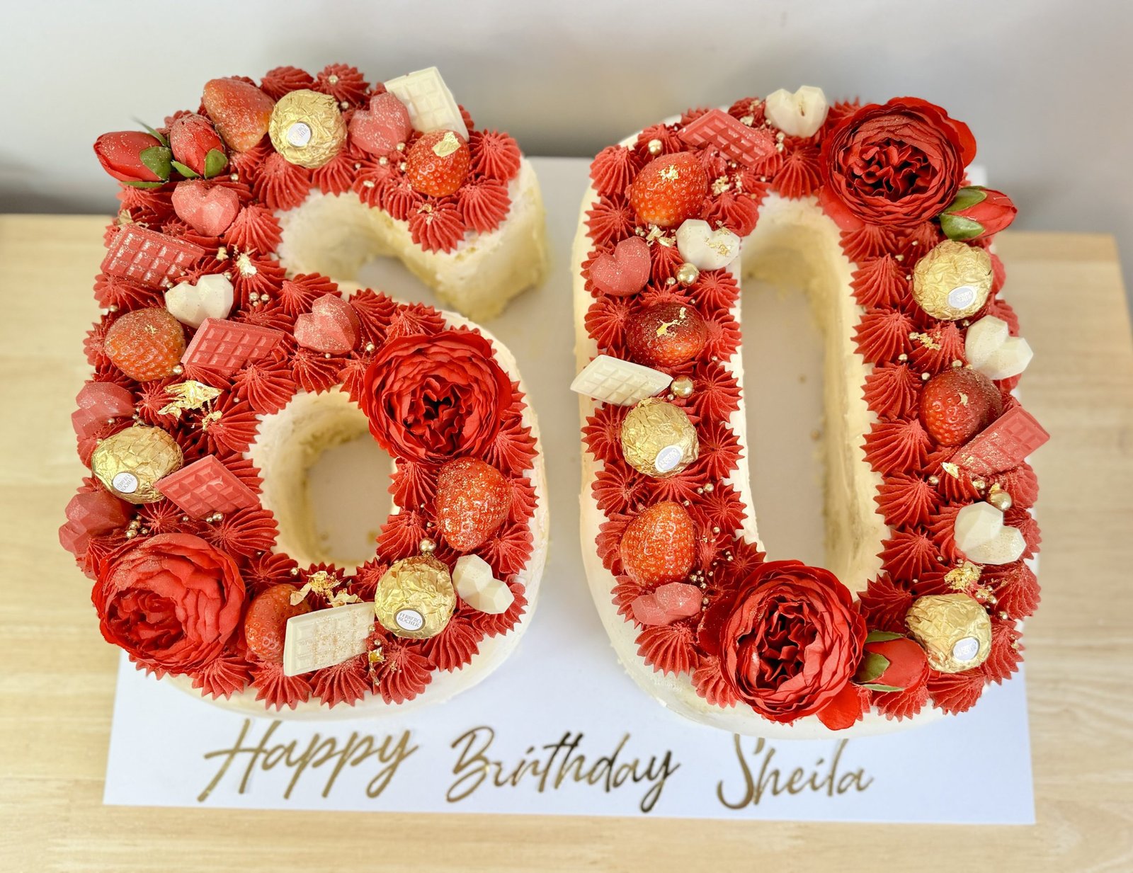 Make any birthday celebration unforgettable with this bold and elegant red and gold number cake. Crafted with soft sponge layers and decorated with rich red buttercream swirls, this cake is adorned with fresh strawberries, luxurious gold chocolates, delicate heart-shaped treats, and decorative flowers. Whether it’s a special birthday or an anniversary, this customisable cake is the perfect centrepiece for any occasion.