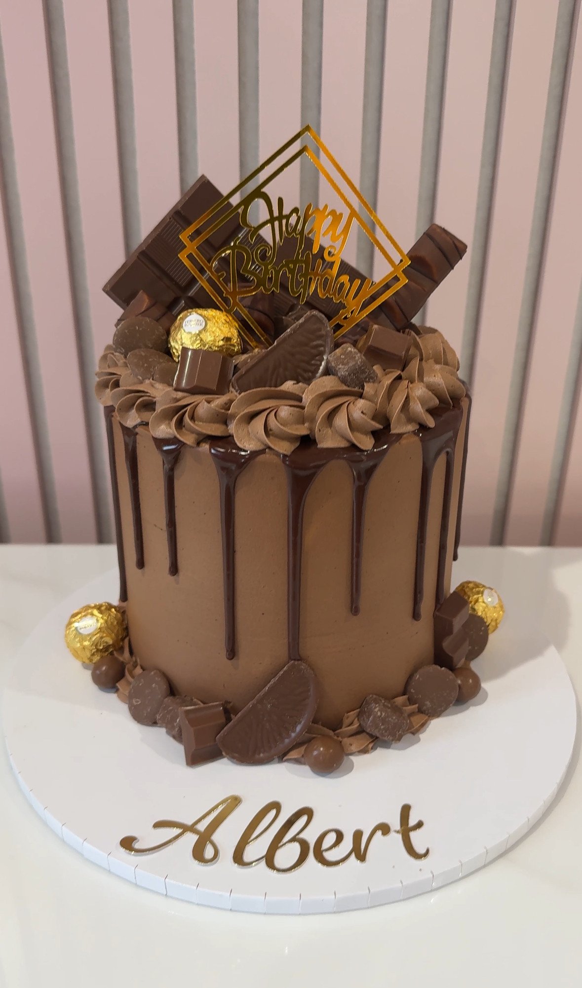 An indulgent chocolate design finished in smooth chocolate buttercream with a rich dark chocolate drip cascading down the sides. The top is generously crowned with swirls of chocolate frosting and an abundant selection of premium chocolates, including chocolate bars, truffles and Ferrero Rocher, creating a striking and decadent centrepiece. Refined gold detailing and a modern acrylic topper complete the look, making this cake a perfect choice for anyone who loves bold flavour and elegant presentation.