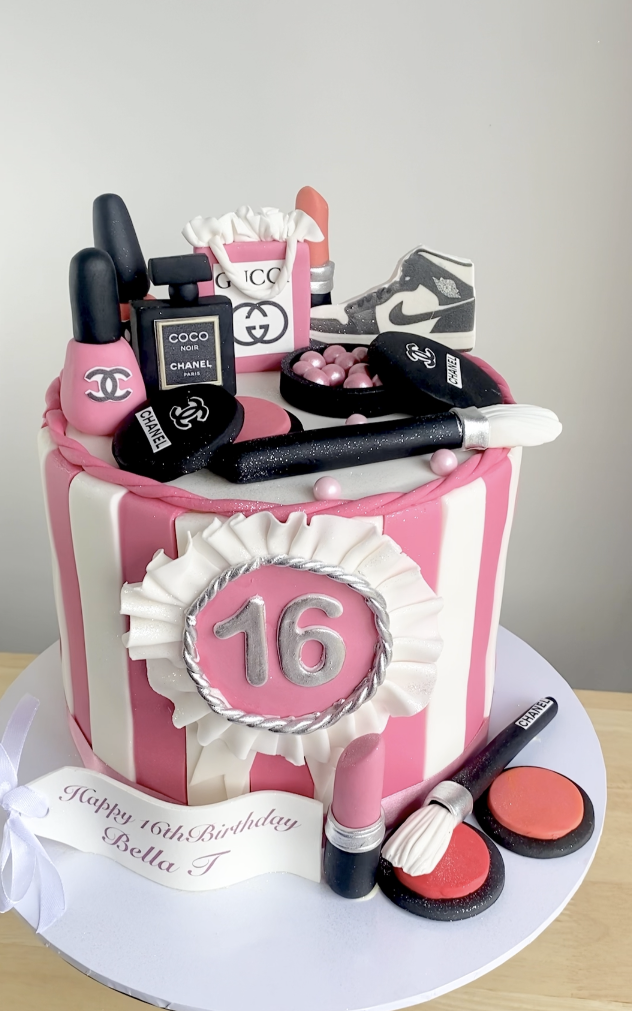 The ultimate cake for fashion and beauty lovers, our Luxury Fashion & Beauty Birthday Cake is a stunning blend of style and indulgence. Decorated with edible makeup, designer-inspired accessories, and intricate fondant detailing, this pink and white striped cake is a showstopper. From lipstick and nail polish to designer bags and sneakers, every detail is crafted to perfection, making it the perfect choice for a stylish birthday celebration.