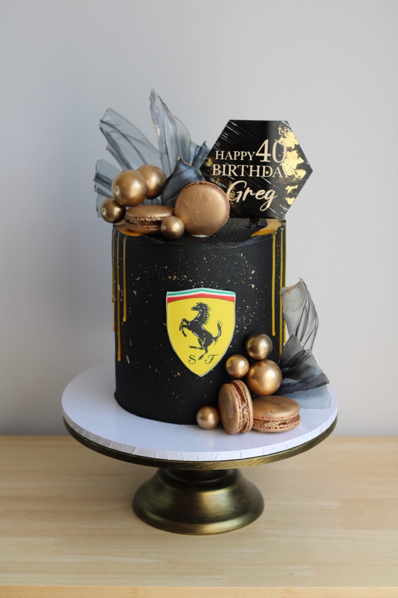 Celebrate speed and style with the Luxury Supercar Cake, the ultimate design for car enthusiasts. Featuring a sleek black buttercream base with elegant gold splatter accents and dripping details, this cake is adorned with an iconic sports car emblem, metallic gold spheres, gourmet macarons (contain nuts), and delicate edible sails for a sophisticated finish. Perfect for birthdays this cake is a statement of power and prestige. Can be tailored to any luxury car brand.