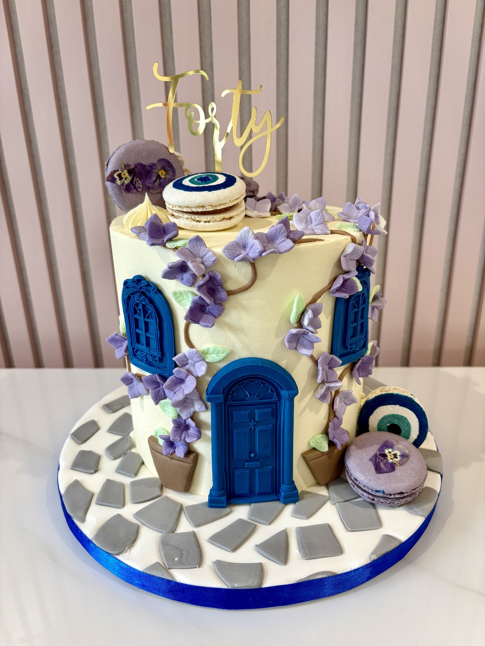 A beautifully styled Mamma Mia inspired celebration cake capturing the charm of a sun-drenched Greek island setting. Finished in soft ivory buttercream with striking royal blue door and window detailing, cascading lilac florals and decorative macarons, this design evokes the romance of Mediterranean streets and coastal celebrations. Elegant, distinctive and full of character, it creates a stunning centrepiece for stylish birthdays and themed parties.