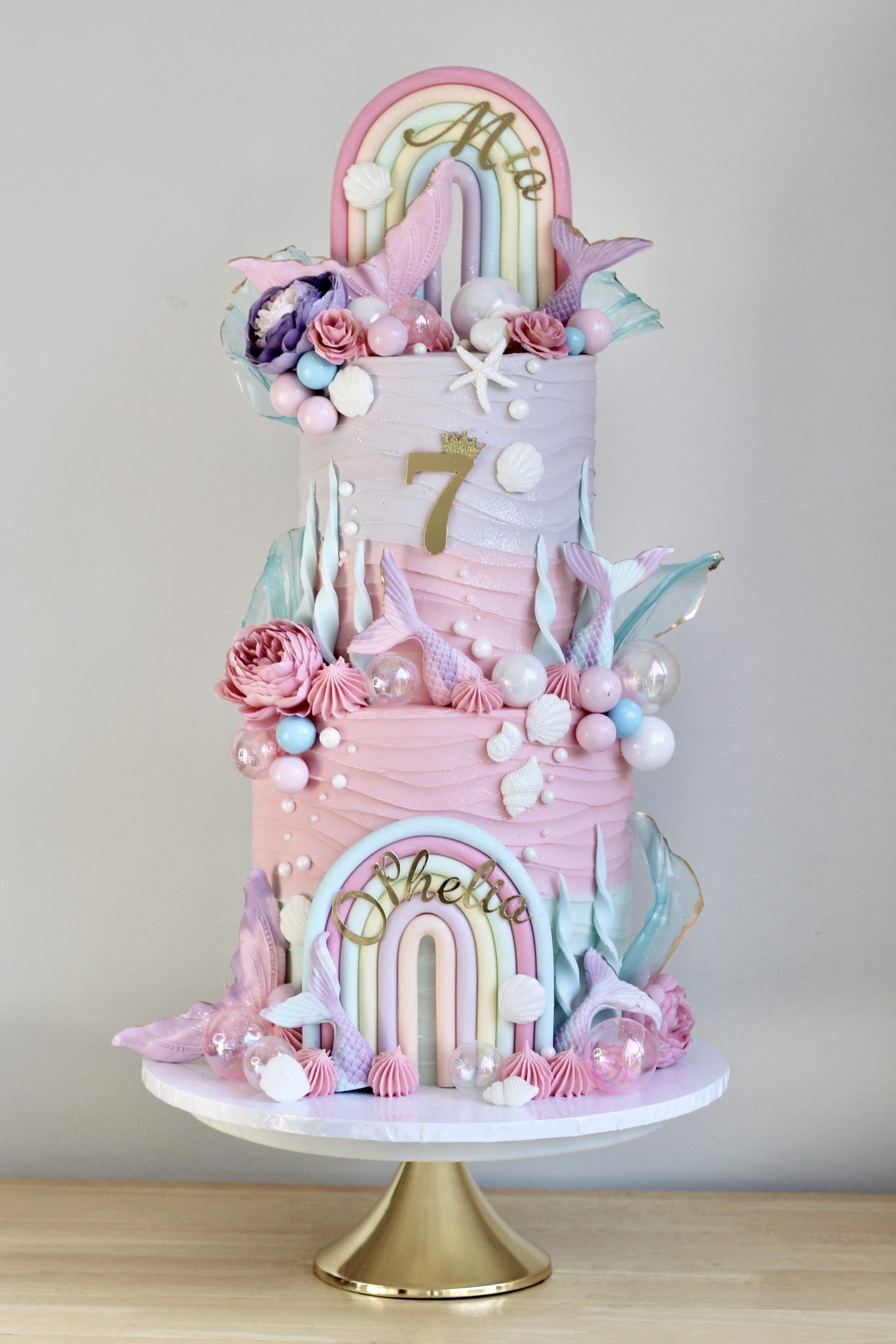 Make a splash at your little one’s birthday with this breathtaking mermaid-themed cake! Designed in dreamy pastel shades of pink, purple, and blue, this enchanting creation features shimmering mermaid tails, delicate seashells, and elegant rainbows for a truly magical under-the-sea experience. Perfect for any mermaid lover, this cake brings a whimsical ocean fantasy to life!