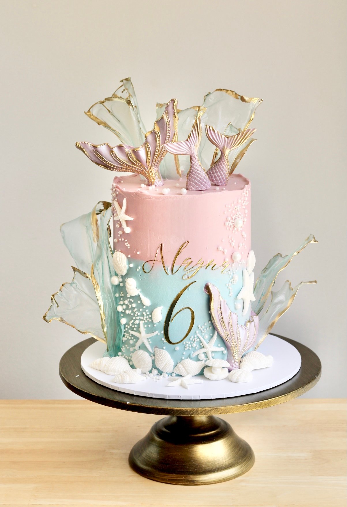 Dive into an underwater dream with this exquisite mermaid-themed birthday cake. Featuring delicate mermaid tails, shimmering edible pearls, and soft pink and blue hues, this cake brings the magic of the ocean to life. The stunning translucent waves with gold accents add a luxurious touch, making it perfect for any little mermaid’s celebration.