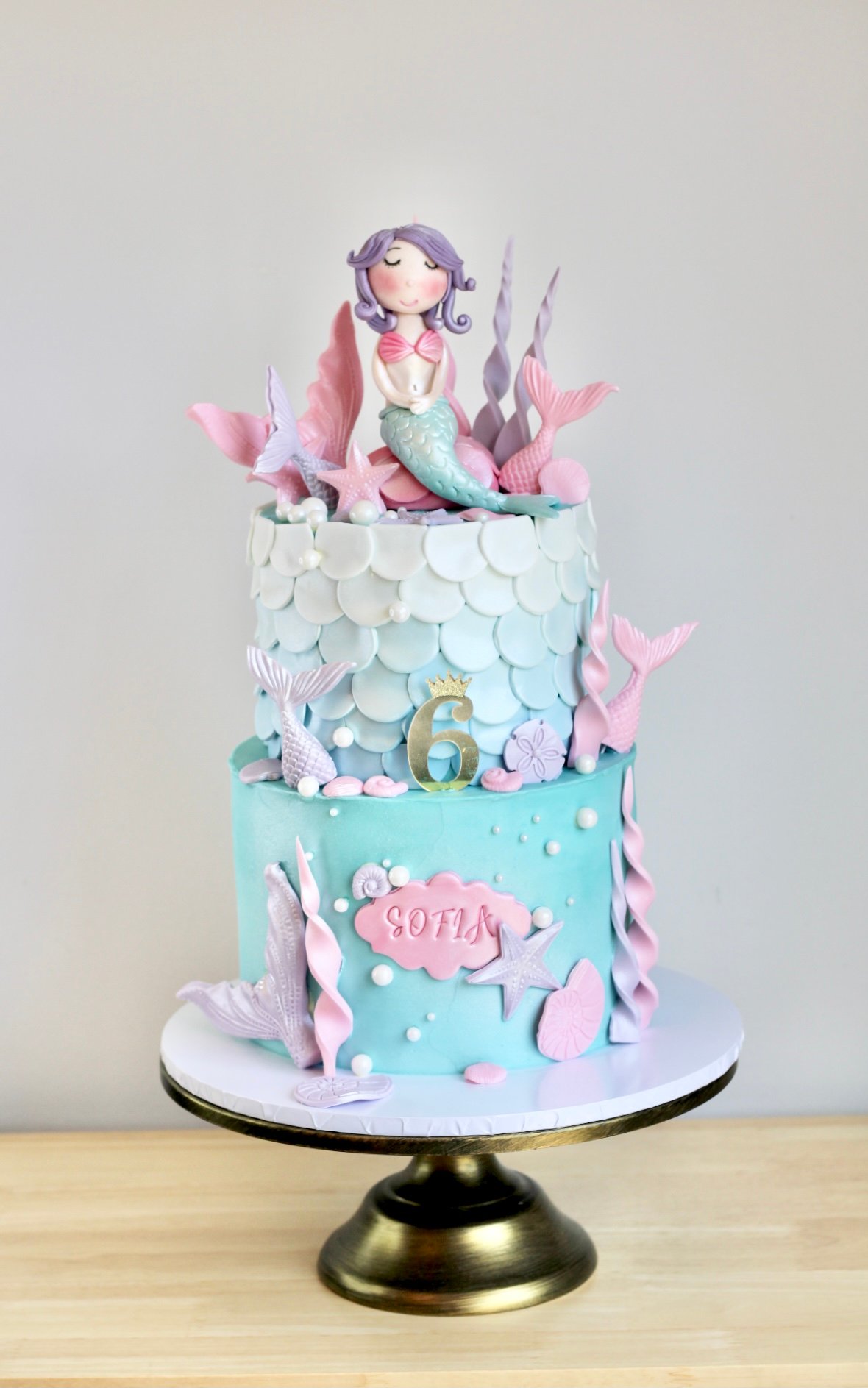 Make a splash with this stunning mermaid cake! Designed with a shimmering ocean theme, this two-tiered beauty features delicate fondant scales, pastel mermaid tails, starfish, pearls, and a graceful mermaid figurine perched on top. Soft blues, pinks, and purples bring an enchanting under-the-sea feel, making it the perfect cake for little mermaids and ocean lovers alike.