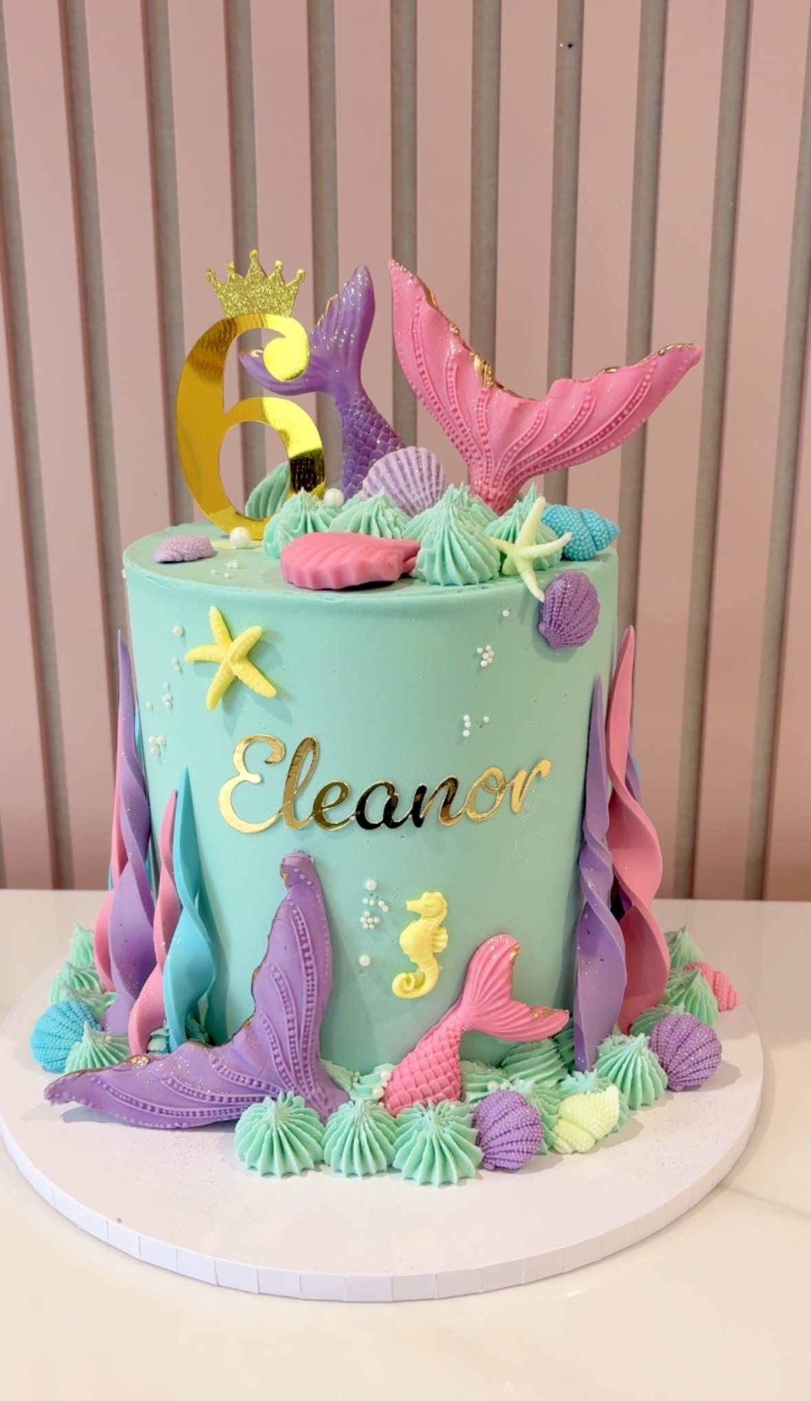 A beautifully detailed under-the-sea design, this mermaid cake features a smooth aqua buttercream finish decorated with pastel shells, starfish and elegant fondant mermaid tails in soft pink and lilac tones. Textured seaweed detailing wraps around the base, while piped buttercream swirls create an ocean-inspired crown on top, finished with a statement age topper and delicate gold name styling across the front. A graceful, eye-catching cake perfect for magical mermaid-themed birthdays.