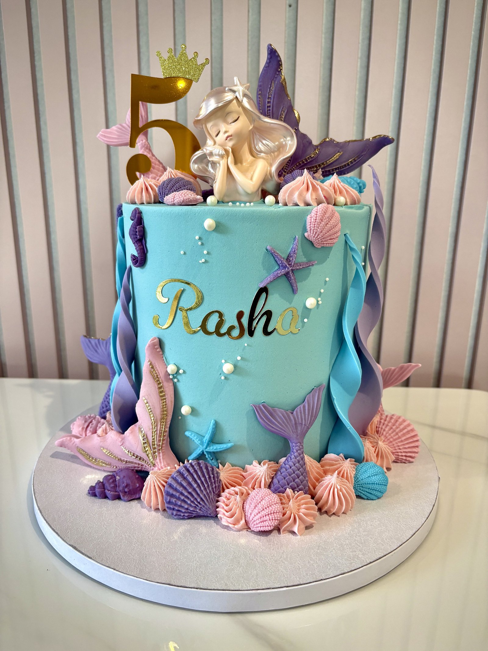 A beautifully detailed mermaid-themed cake designed to create a magical under-the-sea celebration. Finished in ocean-blue buttercream, this elegant design is decorated with flowing fondant waves, pastel seashells, starfish and delicate pearl detailing. A stunning mermaid topper takes centre stage, surrounded by soft pink and lilac accents for a dreamy coastal feel. Personalised with your chosen name and age, this cake makes a charming and eye-catching centrepiece for mermaid-loving birthdays.