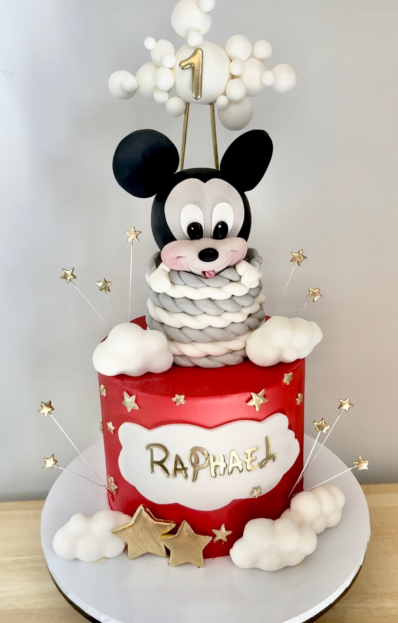 Take celebrations to new heights with Mickey’s Hot Air Balloon Adventure Cake! Featuring a charming hot air balloon design with a Mickey Mouse figure soaring among the clouds, this delightful cake is perfect for any Disney fan. Decorated in red and gold with cloud and star accents, it’s a magical centrepiece for a first birthday or any special occasion.