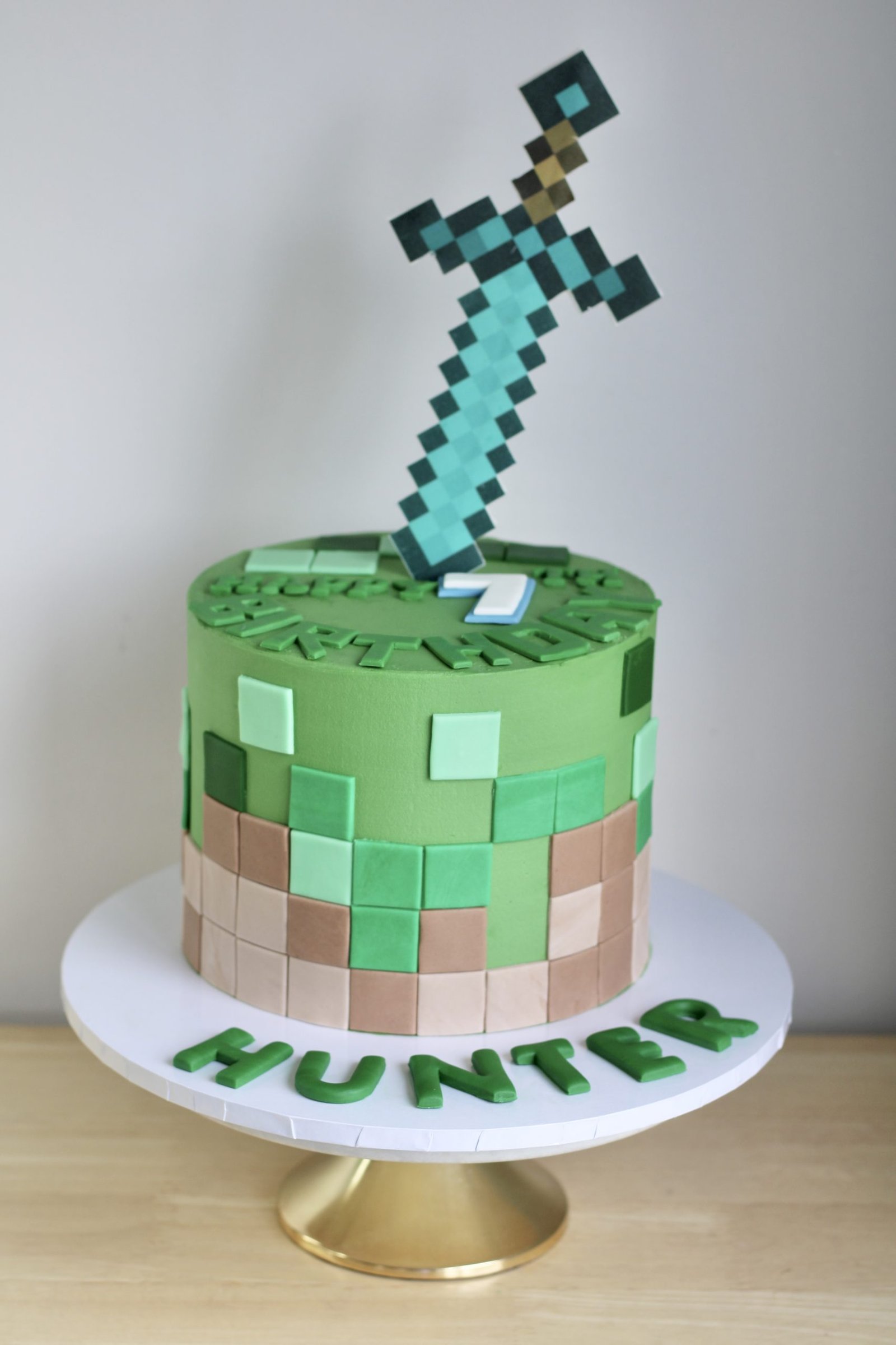 Bring the adventure of Minecraft to life with this pixel-perfect cake, featuring a bold green and brown block design inspired by the game’s iconic landscapes. Topped with a striking 3D pixelated sword, this cake is perfect for any Minecraft fan ready to celebrate in style.