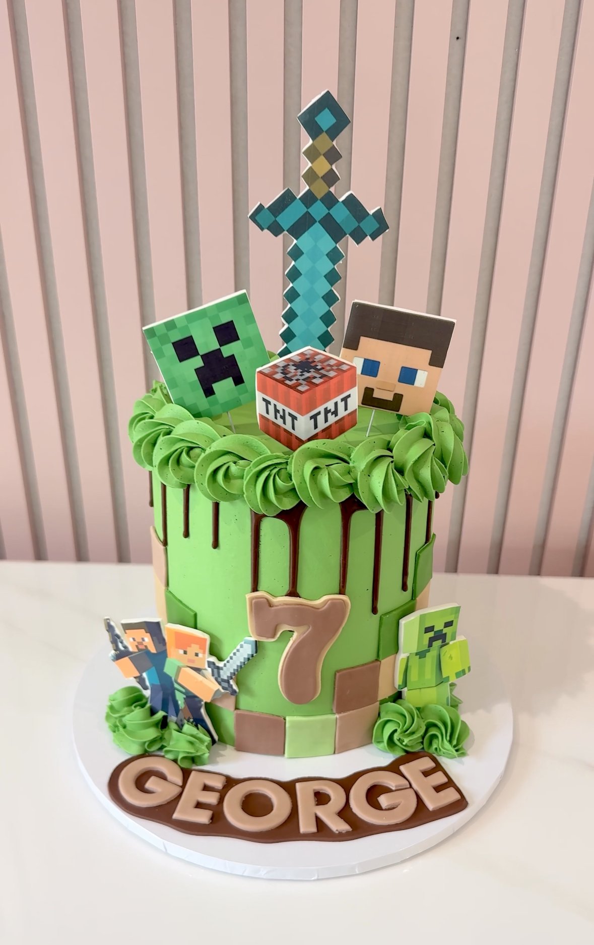 Perfect for little gamers, this action-packed Minecraft cake features all their favourite pixelated characters, vibrant green frosting and chocolate drip. A fun and creative centrepiece for any Minecraft fan’s birthday.