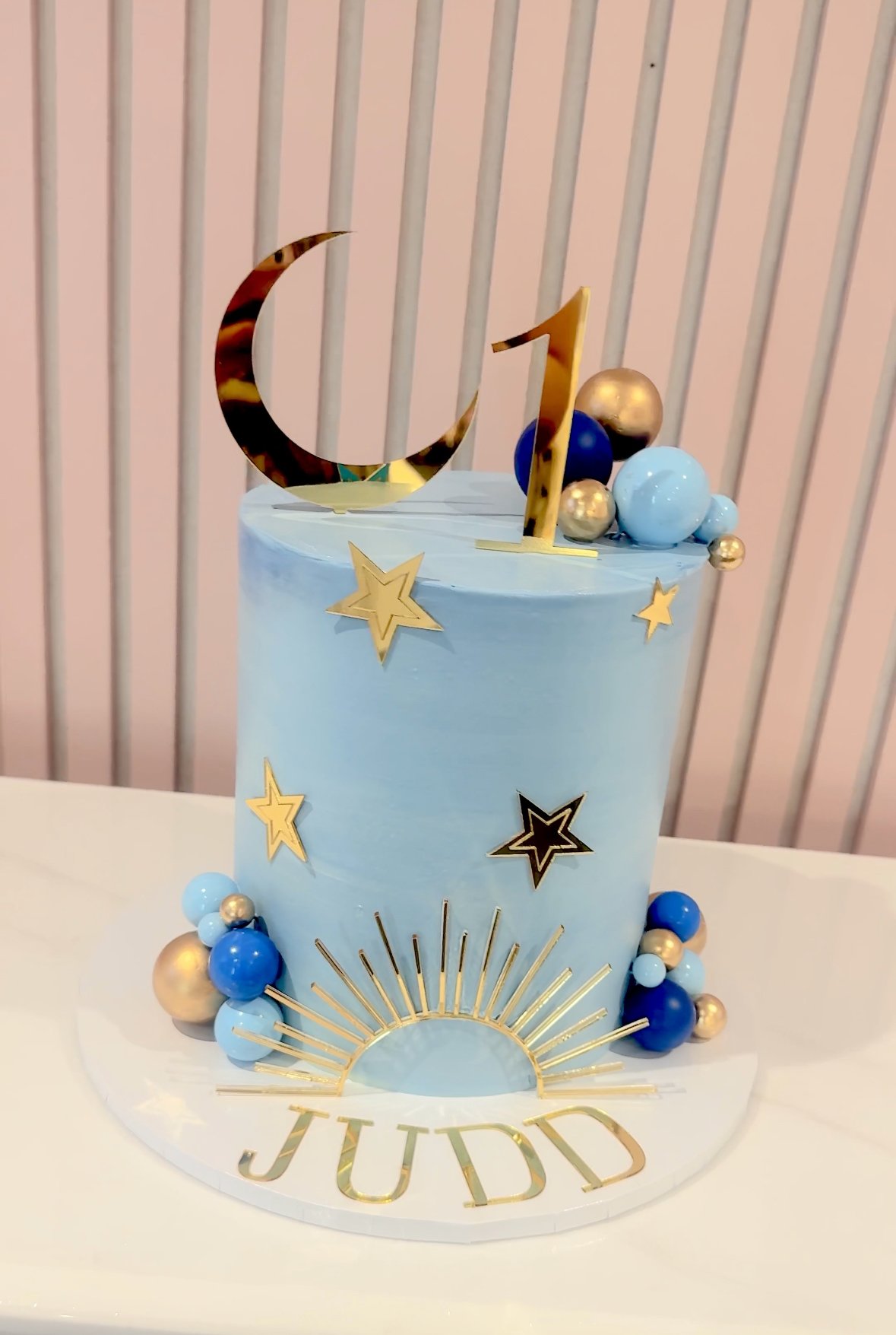 This dreamy celestial-themed cake features a soft sky-blue finish adorned with golden stars, decorative spheres, and a striking gold crescent moon and number topper. Perfect for celebrating a first birthday, this cake captures the magic of the night sky in an elegant and modern design. Finished with a shining sunburst detail and the child’s name in gold, it’s a truly eye-catching centrepiece.