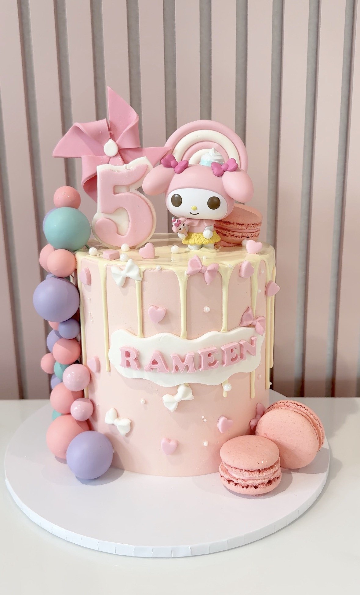 A beautifully sweet My Melody themed cake inspired by the much-loved Sanrio character My Melody. Finished in soft blush pink buttercream with delicate white drip detailing, this tall design is adorned with handcrafted bows, hearts and pastel sphere accents for a charming, playful look. The statement number topper and oversized bow create height and impact, while the personalised name plaque adds a bespoke touch. Sweet macaron (contain nuts) details and layered textures give the cake depth and dimension, making it a standout centrepiece for children’s birthdays and stylish celebrations alike. Fully customised with any age, name and colour adjustments, this cake is perfect for little ones who adore all things cute and pastel.