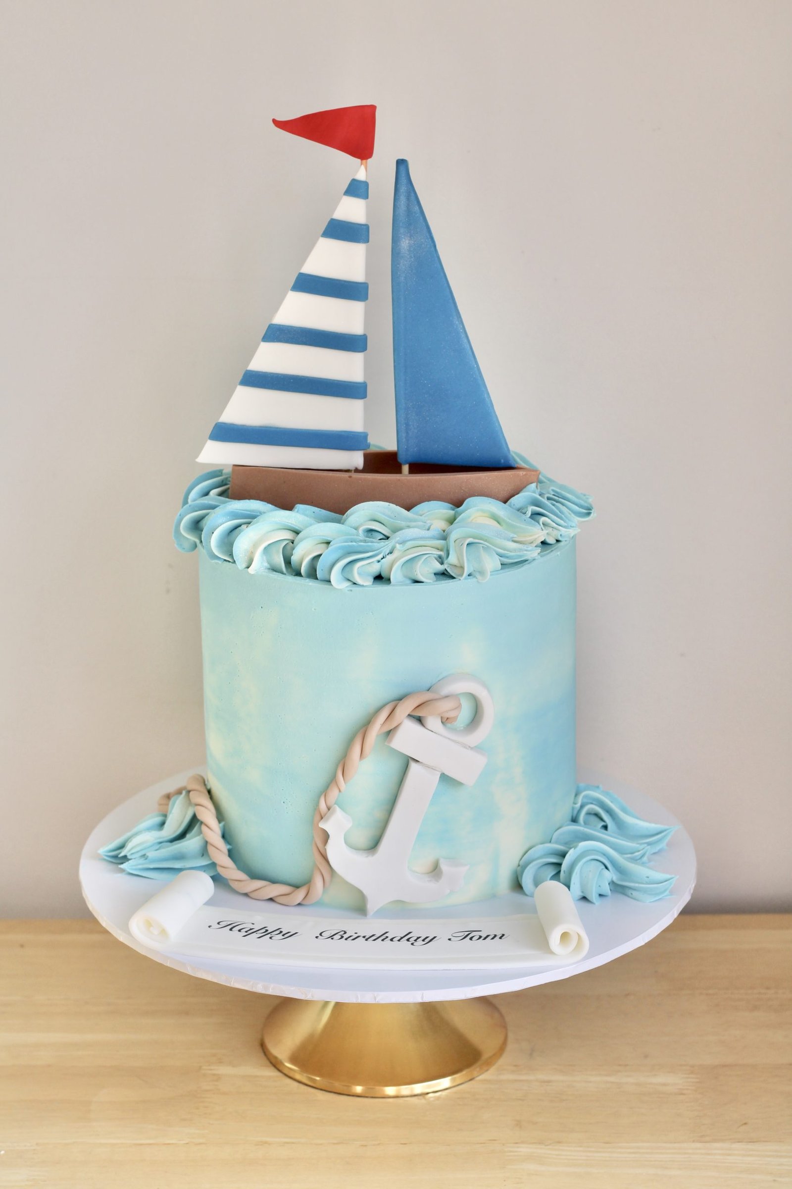 Set sail on a delicious adventure with our Nautical Adventure Cake! Featuring a stunning ocean-inspired buttercream base with soft blue hues, this cake is topped with a handcrafted fondant sailboat, complete with striped sails and a bold red flag. Edible waves, an elegant anchor, and rope detailing add to the maritime charm, making this the perfect cake for sea lovers, sailors, and nautical-themed celebrations.