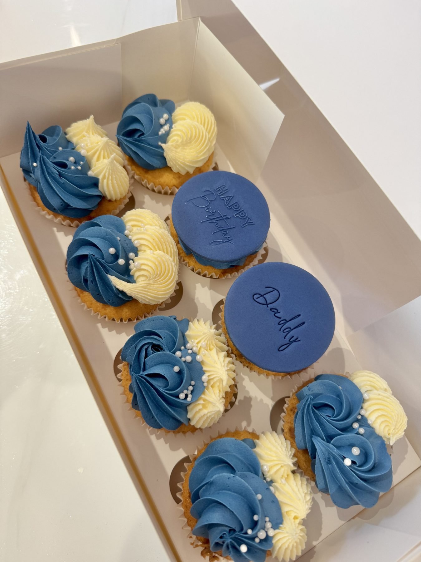 These navy and ivory cupcakes offer a clean, modern take on classic celebration cupcakes. Decorated with smooth buttercream swirls in deep navy and soft ivory tones, each cupcake is finished with delicate pearl detailing for a polished, refined look. Selected cupcakes are topped with a sleek fondant disc, creating a balanced and elegant presentation that works beautifully for adult birthdays and understated celebrations.