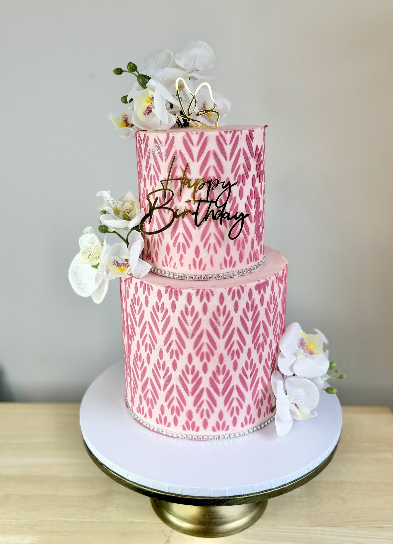 Elevate any celebration with the Orchid Elegance Cake, a stunning two-tiered masterpiece designed for those with a taste for luxury. Adorned with intricate pink patterns, delicate pearl accents, and beautifully arranged artificial orchids, this cake exudes sophistication. Finished with a flawless buttercream coating and a lustrous sheen, it’s a showstopper for birthdays and special occasions.