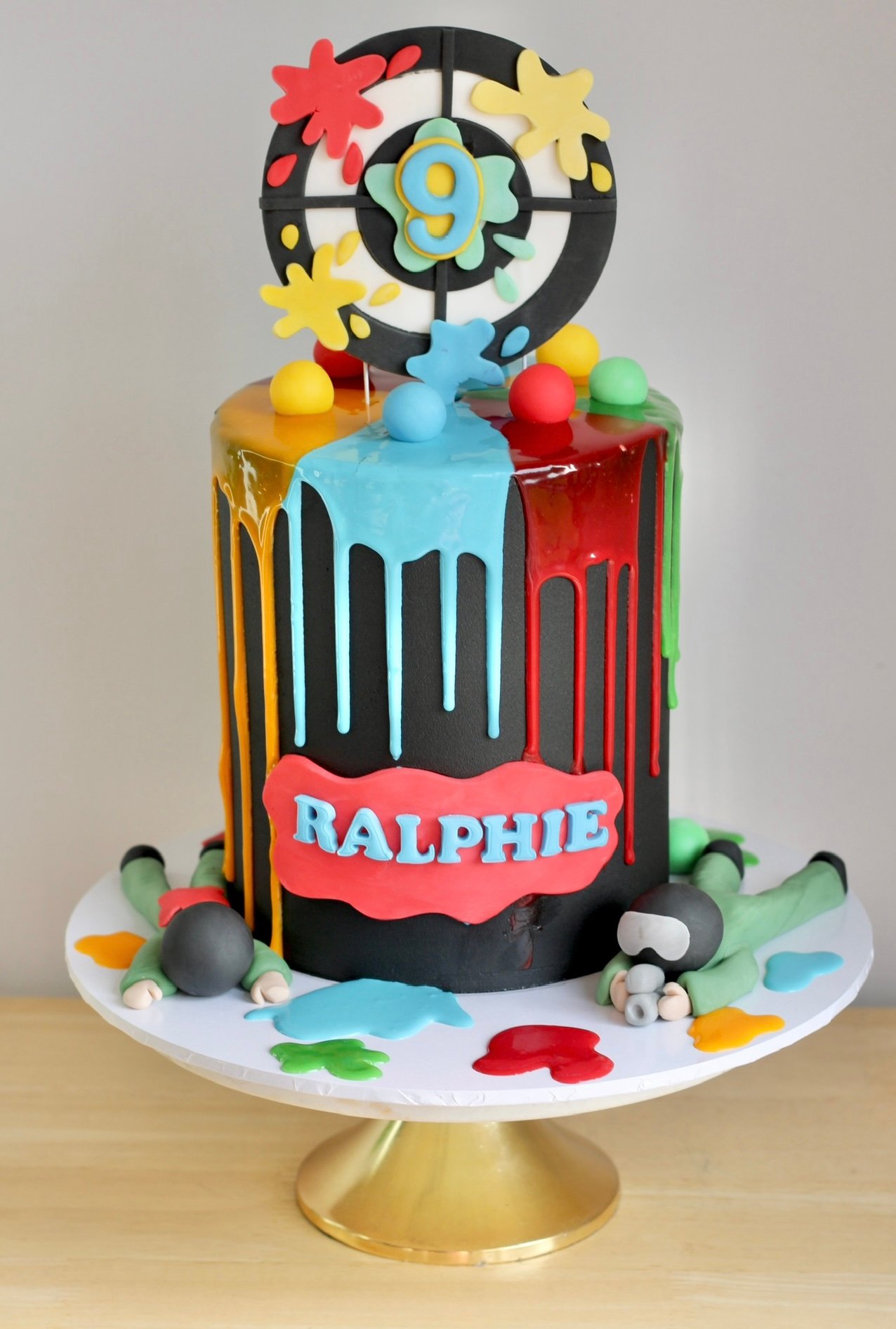 Get ready for an action-packed celebration with our Paintball Battle Cake! Designed for thrill-seekers, this bold cake features a black base with vibrant splashes of colourful “paint” dripping down the sides. Complete with fondant paintball players in action and a striking target topper, it’s a must-have for any paintball enthusiast. Perfect for birthdays or adventure-themed parties!