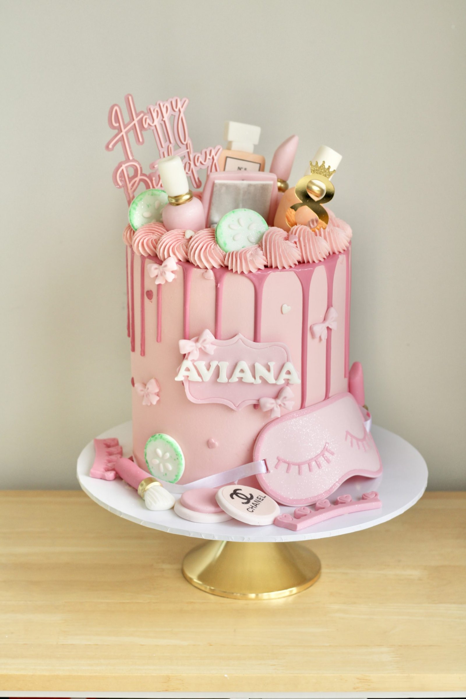 Treat the birthday girl to the ultimate spa-inspired celebration with this gorgeous pamper-themed cake. Covered in soft pink tones with a luxurious drip effect, this beauty is adorned with edible decorations including an eye mask, perfume bottles, makeup brushes, and cucumber slices for a true spa-day feel. Perfect for a beauty lover’s birthday, this cake brings relaxation and indulgence to the party in the sweetest way!