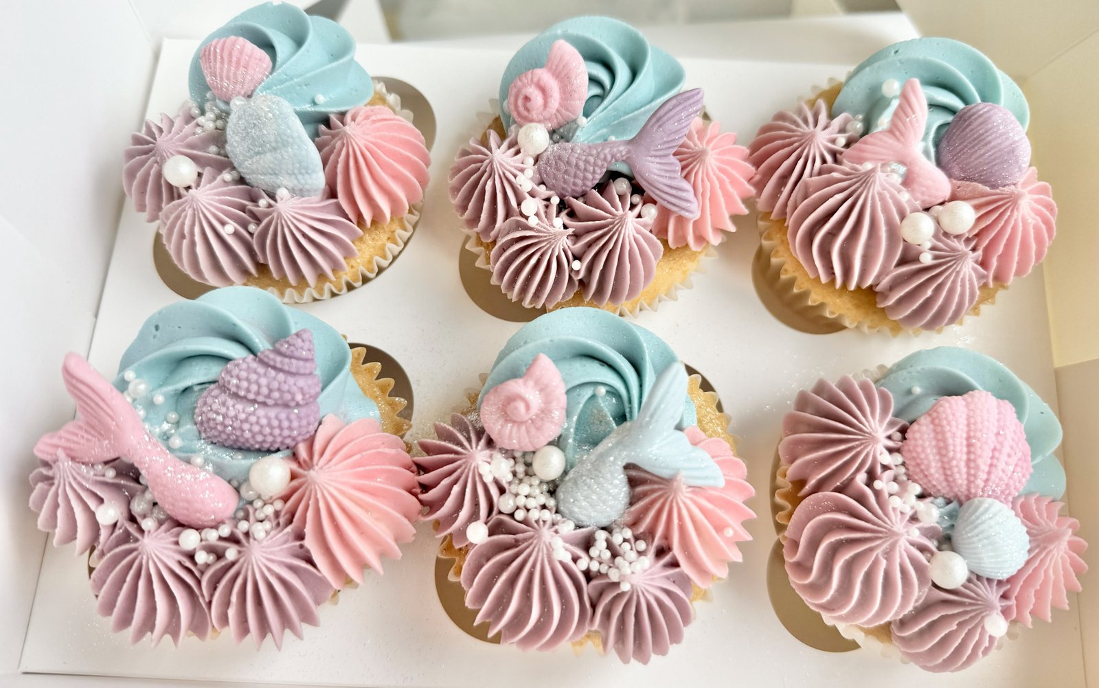 A delicate box of pastel seashell cupcakes, decorated with soft buttercream swirls in blush pink, lilac and seafoam blue. Each cupcake is finished with elegant fondant shells, mermaid tails and pearlescent sprinkles, creating a refined under-the-sea look. Perfect for birthdays, baby showers or ocean-inspired celebrations, these cupcakes can be tailored to suit your colour palette or occasion.