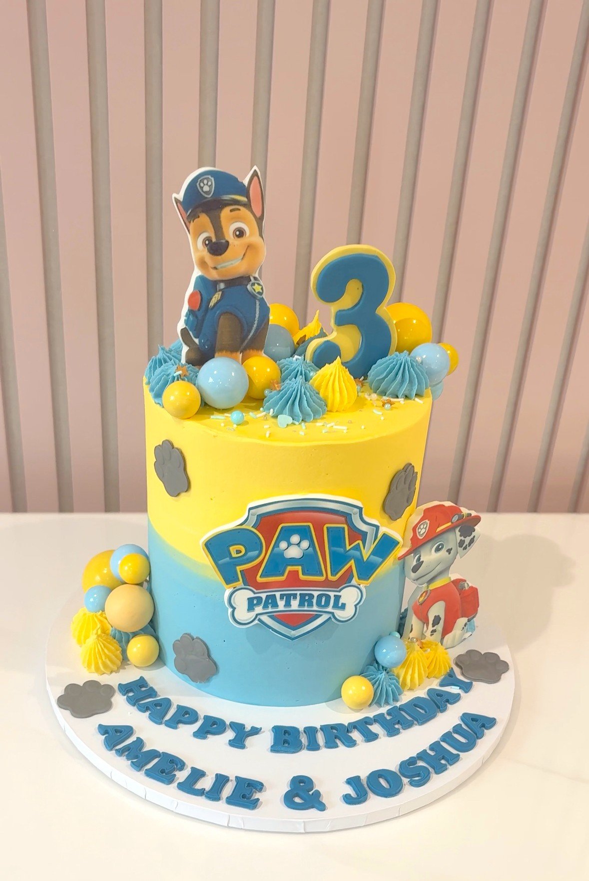 A bright and playful Paw Patrol-themed celebration cake finished in bold yellow and blue buttercream with coordinating character toppers and logo detailing. Decorated with paw print accents, colourful buttercream swirls and glossy decorative spheres, this design captures the fun and adventure of the much-loved series. Perfect for little fans, it creates an eye-catching centrepiece full of colour, character and birthday excitement.