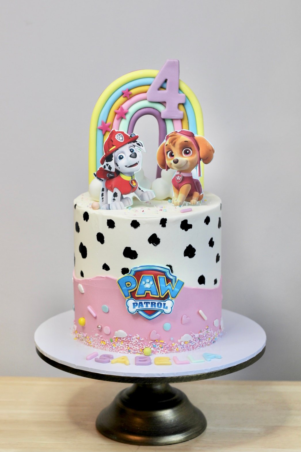 Make your little Paw Patrol fan’s birthday extra special with this adorable cake featuring their favourite rescue pups! This charming design includes a dalmatian-spotted top tier, a pastel pink base with sprinkles, and a colourful rainbow topper. Skye and Marshall take centre stage, ready for adventure, while the iconic Paw Patrol badge completes the look. A fun and playful cake perfect for a young girl’s celebration!