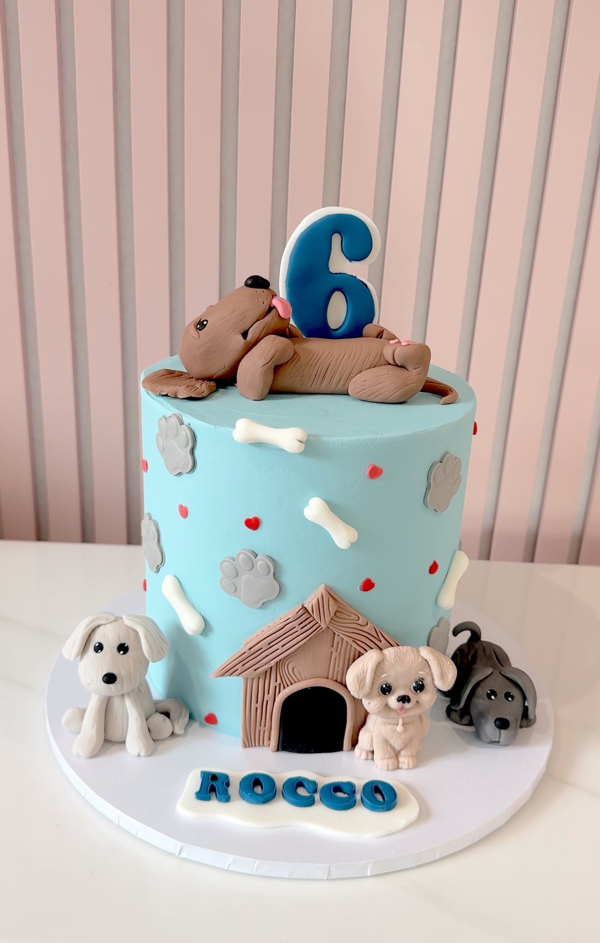 A playful dog-themed cake that’s bound to be a hit with any young animal lover. Covered in sky-blue buttercream and decorated with fondant paw prints, bones, and little red hearts, this cake is full of charm. The design features a wooden kennel surrounded by adorable fondant puppies, with a larger pup lounging happily on top beside a birthday number. A paw-some choice for a fun and memorable children’s celebration.