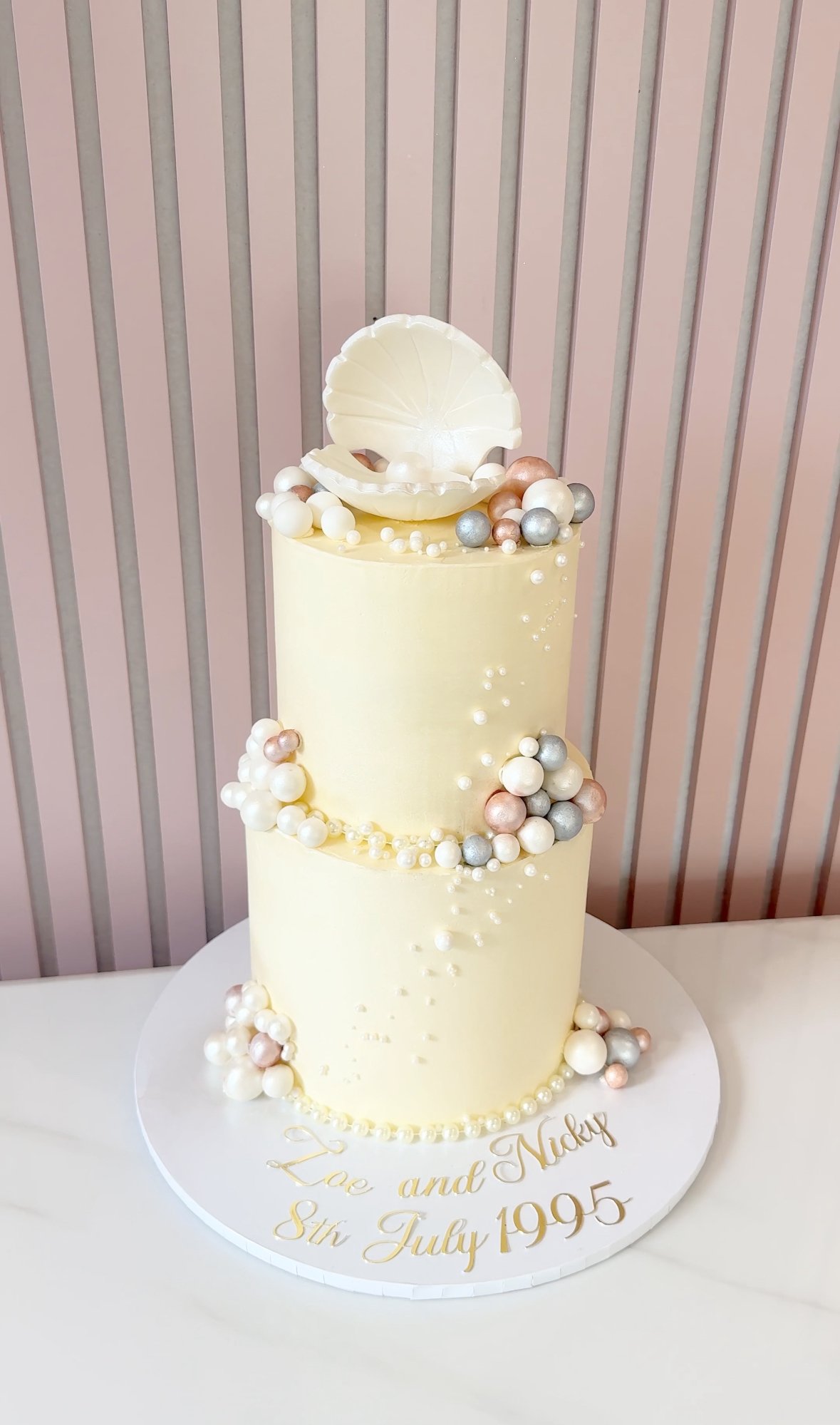 Celebrate 30 years of love with this elegant Pearl Wedding Anniversary Cake. Decorated in soft ivory tones and adorned with an arrangement of lustrous edible pearls in white, silver, rose gold, and champagne, this two-tier design radiates timeless sophistication. A handcrafted open shell sits proudly on top, symbolising the treasured years together. Finished with delicate pearl trails cascading down each tier, this cake is a beautiful way to mark such a meaningful milestone.