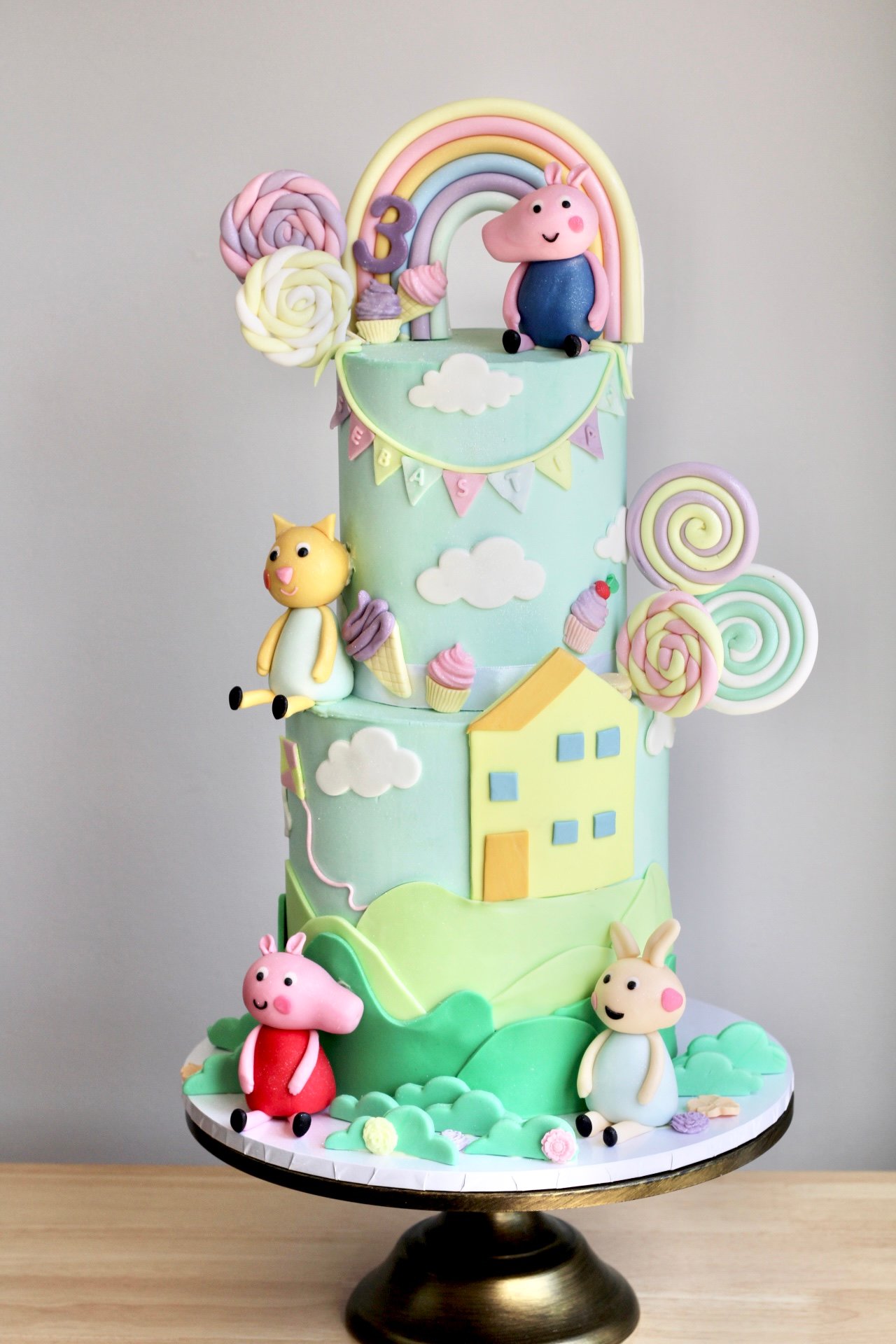 Step into a world of pastel dreams with the Peppa Pig Cake V01, a magical delight for young fans of Peppa and her friends! This beautifully crafted two-tier cake features soft pastel hues, whimsical clouds, lollipops, cupcakes, and an adorable rainbow arching over Peppa. Joined by familiar faces like Suzy Sheep and Candy Cat, this cake captures the charm of the beloved show in a stunning and playful design. Perfect for birthdays, this cake is sure to bring joy and excitement to the celebration!