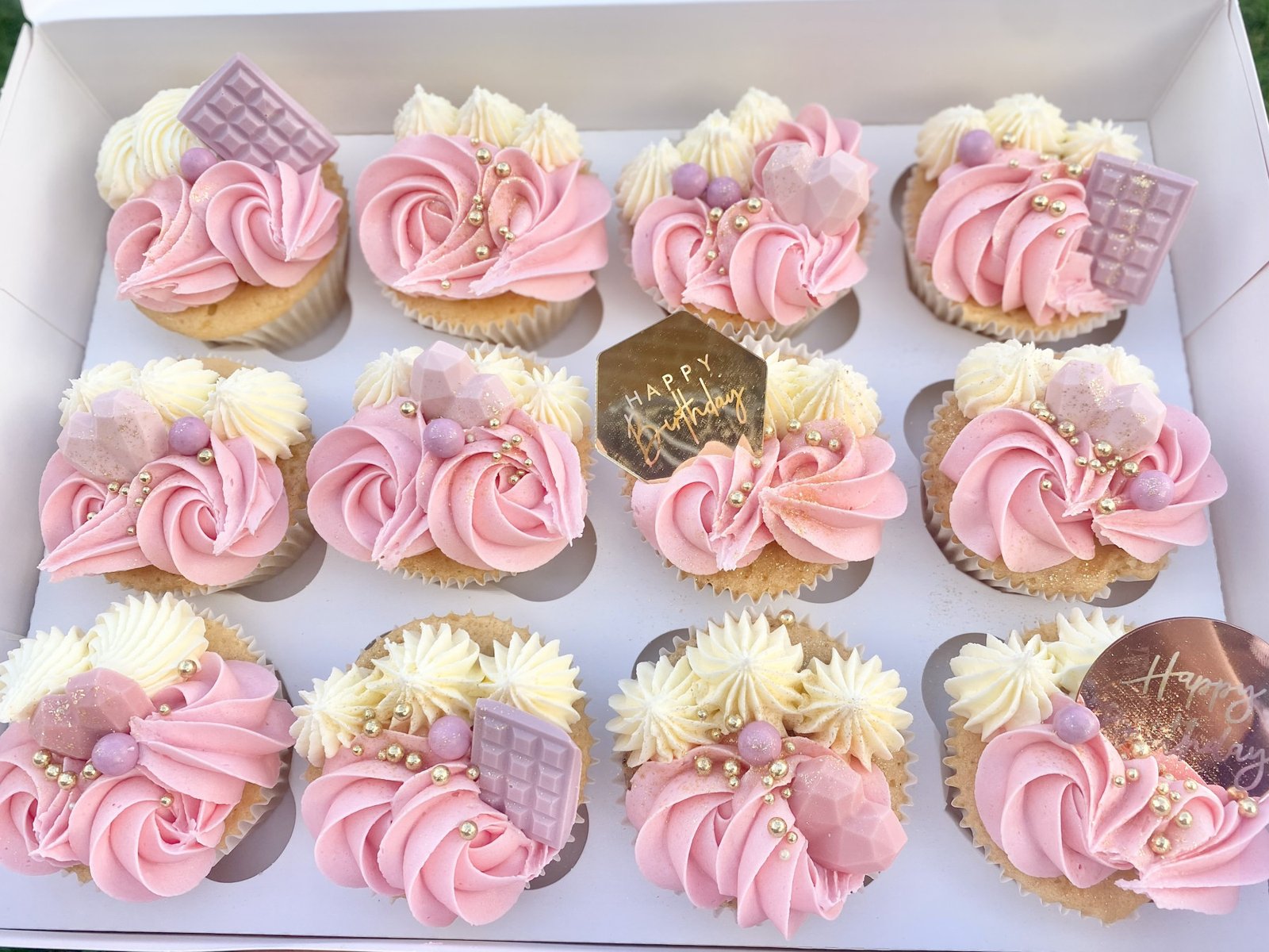 An elegant box of pink chocolate cupcakes finished with soft blush buttercream swirls, delicate vanilla accents and refined gold detailing. Decorated with decorative chocolate-style elements, pearl sprinkles and subtle shimmer, these cupcakes are designed exactly as seen and make a beautiful choice for stylish celebrations and refined occasions.