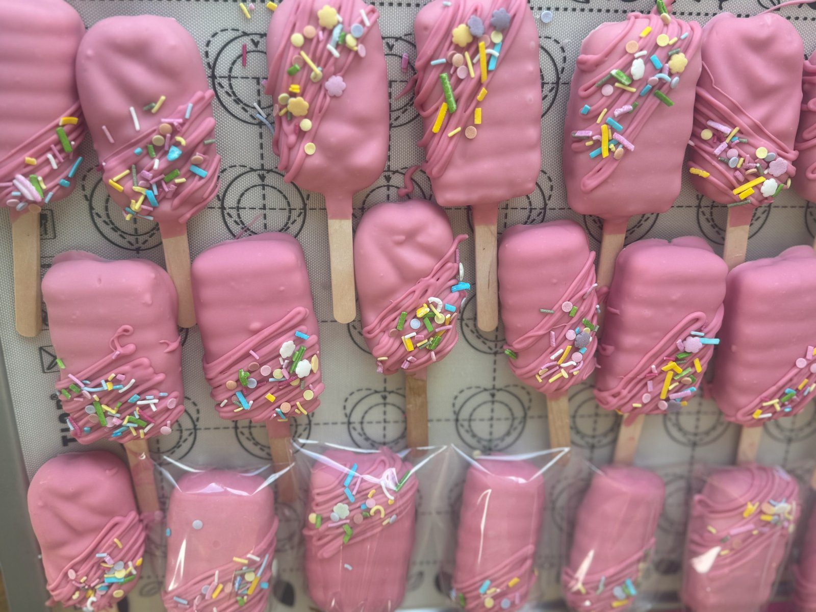 These pink cakesicles are finished with a smooth chocolate coating, delicate drizzle detailing, and a scatter of colourful sprinkles for a fun yet refined look. Simple, eye-catching, and easy to style, they’re a popular choice for birthdays, parties, and modern dessert tables.