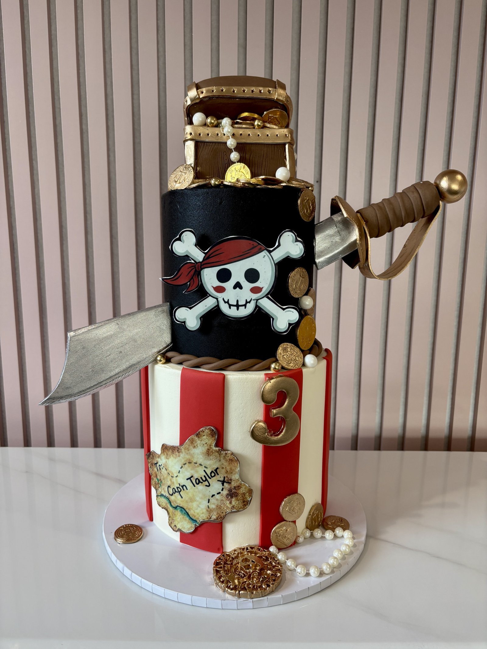 This bold pirate-themed cake is designed with striking vertical red and white stripes, dramatic skull detailing, and a treasure-inspired finish. Featuring a detailed pirate emblem, sword elements, scattered gold coins, and a treasure chest topper, the cake has a rich, adventurous look with plenty of character. A personalised plaque and number accent complete the design, making it a standout centrepiece for a pirate fan. The cake can be customised for any age, name, or colour palette.