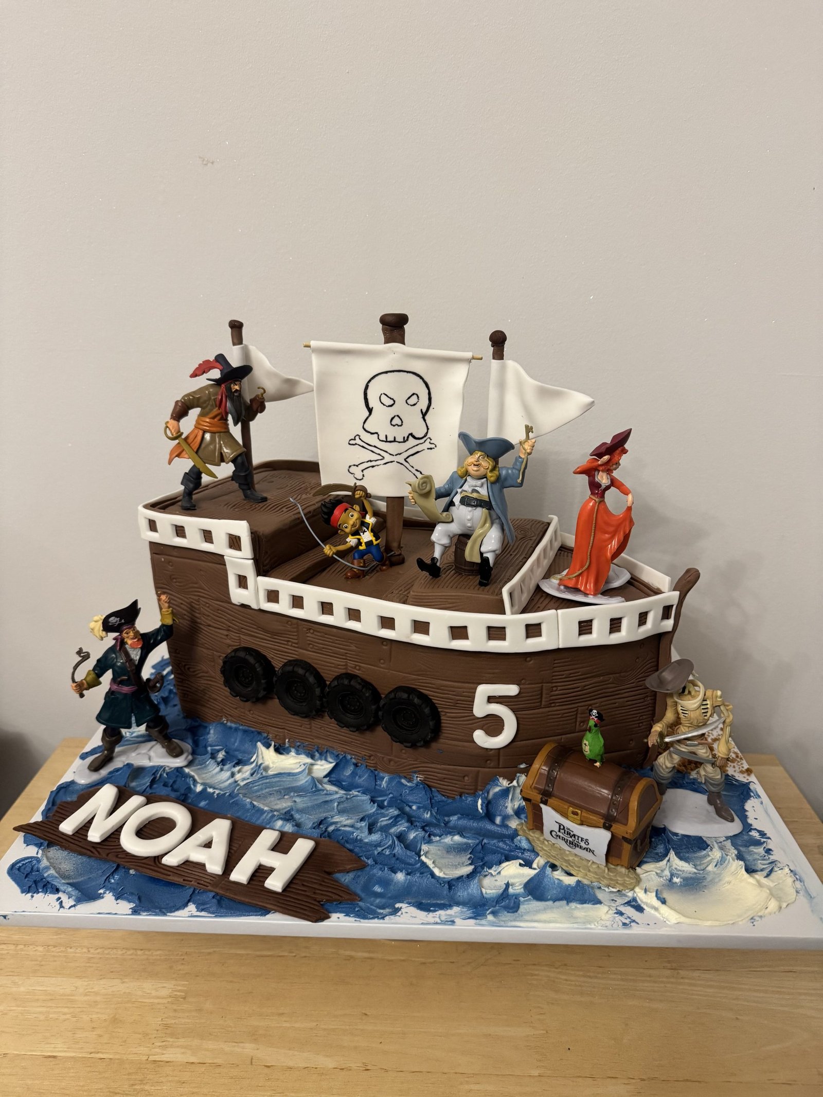 Ahoy, matey! Set sail for an epic birthday adventure with our incredible Pirate Ship Cake. Crafted to resemble a classic pirate vessel, this cake is decorated with rich chocolate-textured fondant, white sails featuring the iconic skull and crossbones, and waves of swirled buttercream. Complete with detailed pirate figurines, a treasure chest, and a bold name plaque, this cake is a showstopping centrepiece for any young buccaneer’s celebration. A must-have for little swashbucklers who dream of the high seas!