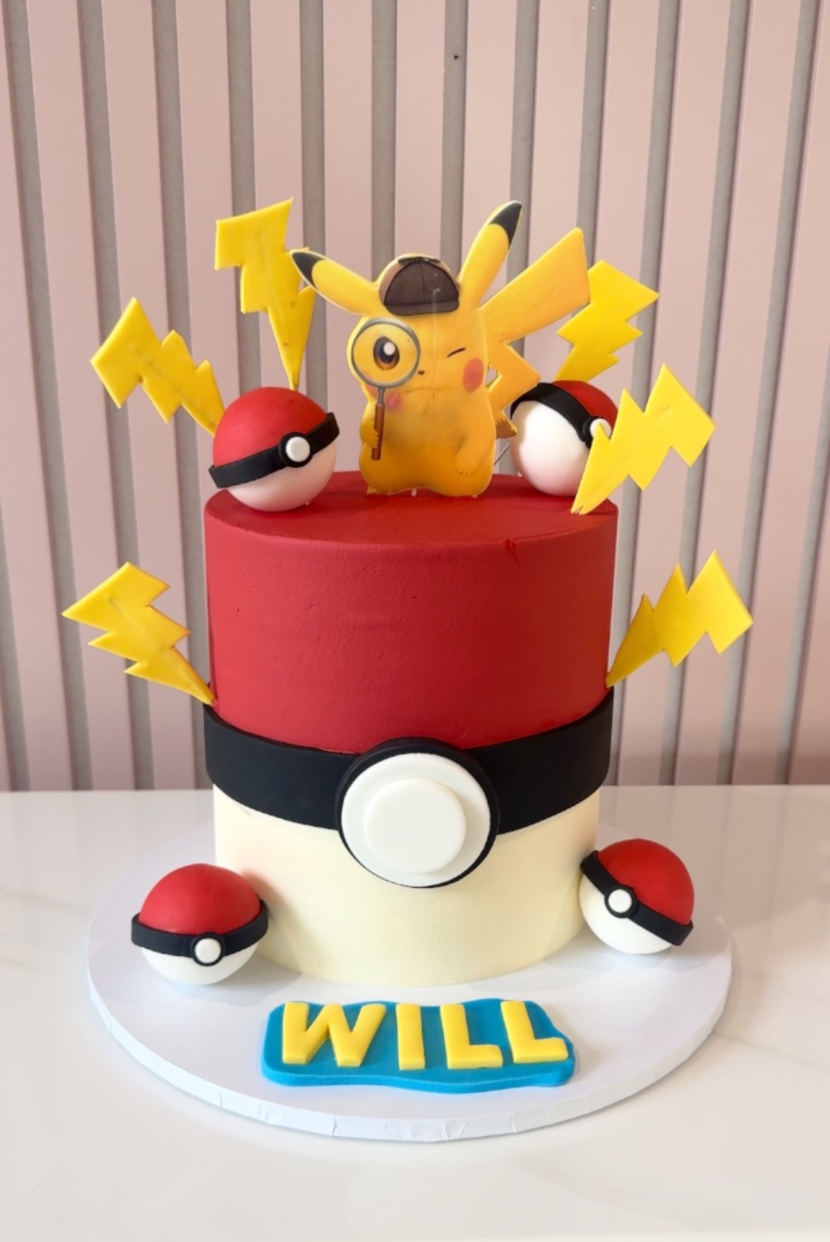 Catch the fun with this bold and playful Pokemon cake! Designed like a classic Poké Ball, it features lightning bolts, Poké Balls, and a winking Pikachu dressed as a detective on top. A must-have for any young trainer and perfect for fans of the world’s most iconic Pokémon.