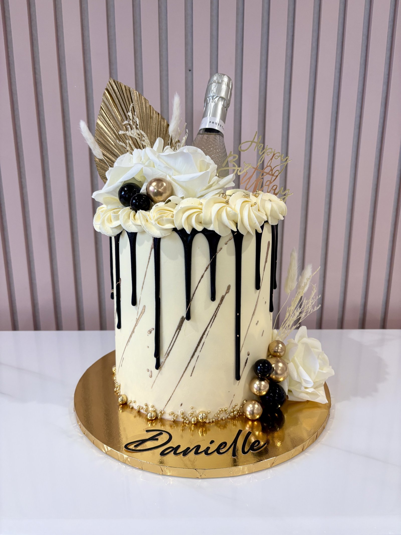 A bold and sophisticated celebration cake designed for unforgettable moments. Finished in smooth ivory buttercream with dramatic black ganache drips and subtle gold detailing, this design is elevated with artificial florals, metallic spheres and a Prosecco bottle feature for a statement finish. The combination of black, gold and ivory creates a refined, glamorous look that is perfect for birthdays and special occasions for her. Personalisation can be added to suit the celebration, making it a true centrepiece cake.
