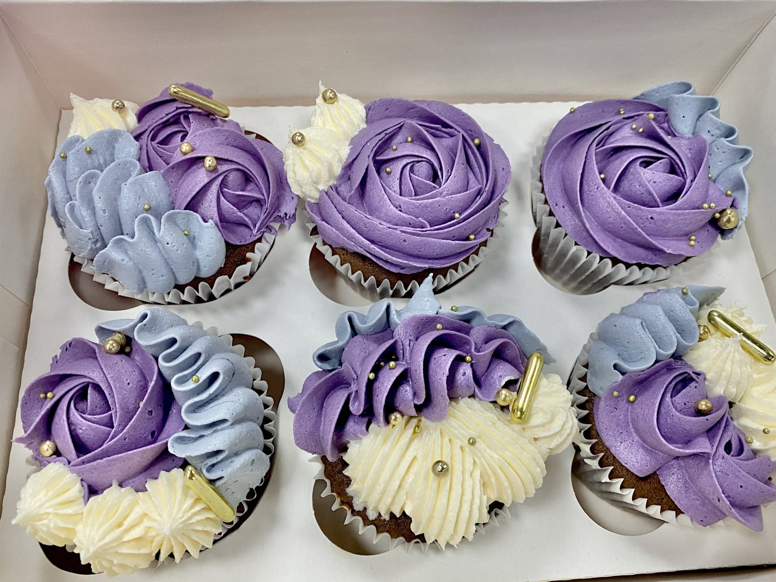 A striking set of birthday cupcakes decorated with sculpted buttercream swirls in rich purple, soft lilac, and ivory tones, finished with gold accents for a refined, modern look. The layered piping and elegant colour palette give these cupcakes a confident, celebratory feel, making them a beautiful choice for birthdays where style and presentation matter just as much as the occasion.