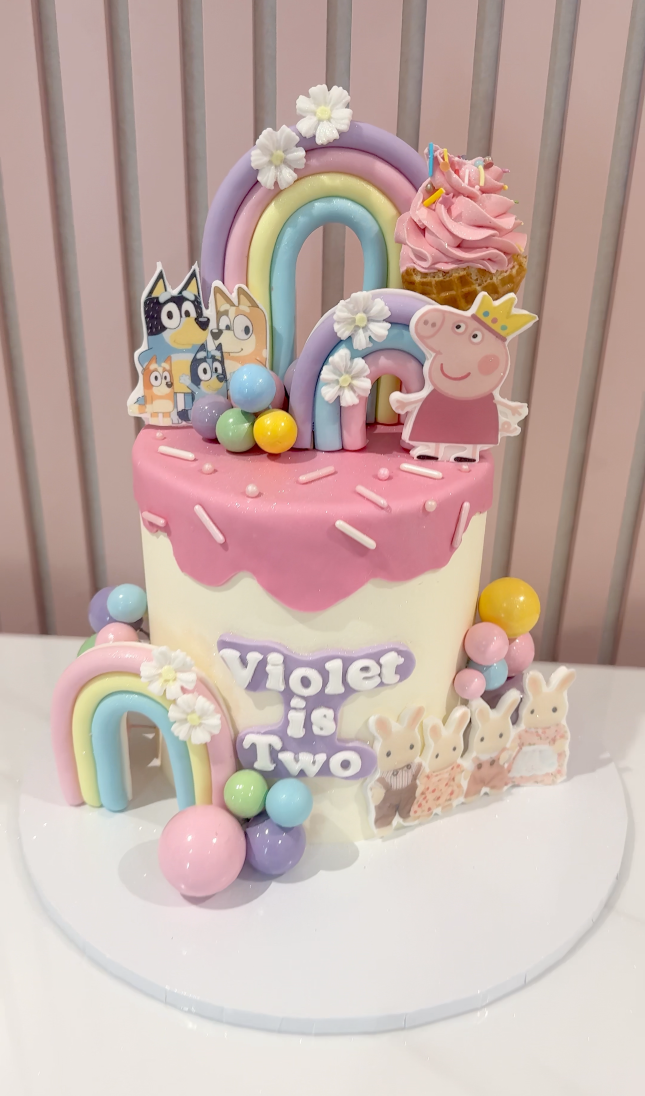 A joyful celebration of childhood favourites, this pastel drip cake features Peppa Pig, Bluey, and the adorable Sylvanian Families. Decorated with fondant rainbows, colourful sprinkles, and playful icing balls, it’s topped with a pink cupcake and finished with daisy details. Perfect for a little one’s birthday, this design can be customised with any age and name to suit your celebration.