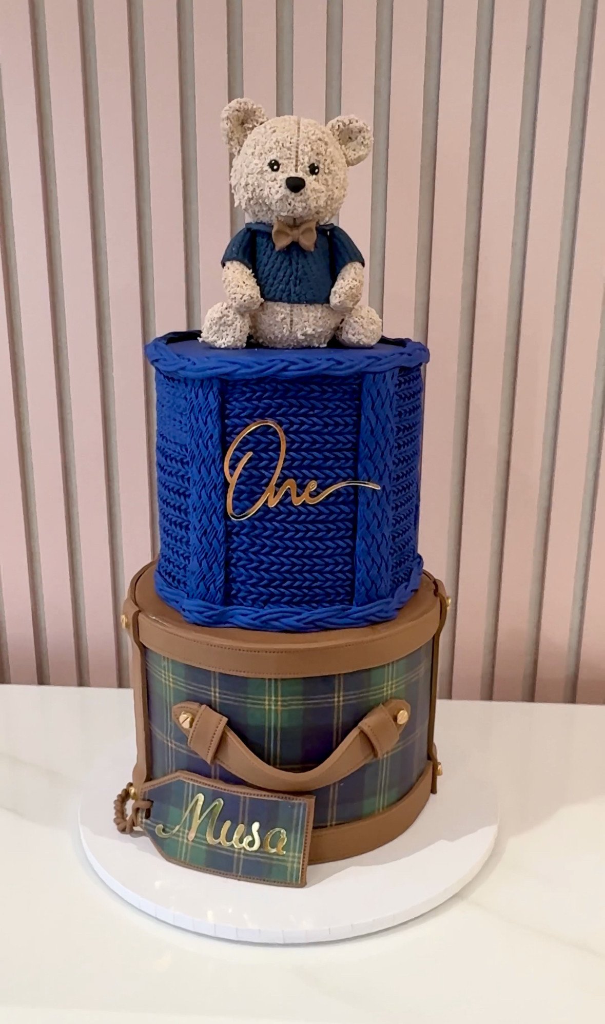 This Ralph Lauren–inspired teddy bear cake is a refined two-tier design that blends classic heritage style with charming detail. The top tier features a beautifully textured knit-effect finish in deep navy, crowned with a handcrafted teddy bear wearing a smart jumper and bow tie. The lower tier is styled to resemble a luxury tartan travel case, complete with realistic strap detailing and a personalised luggage tag. Rich tones, tailored textures, and timeless design make this cake perfect for a sophisticated first birthday or stylish celebration with a traditional feel.