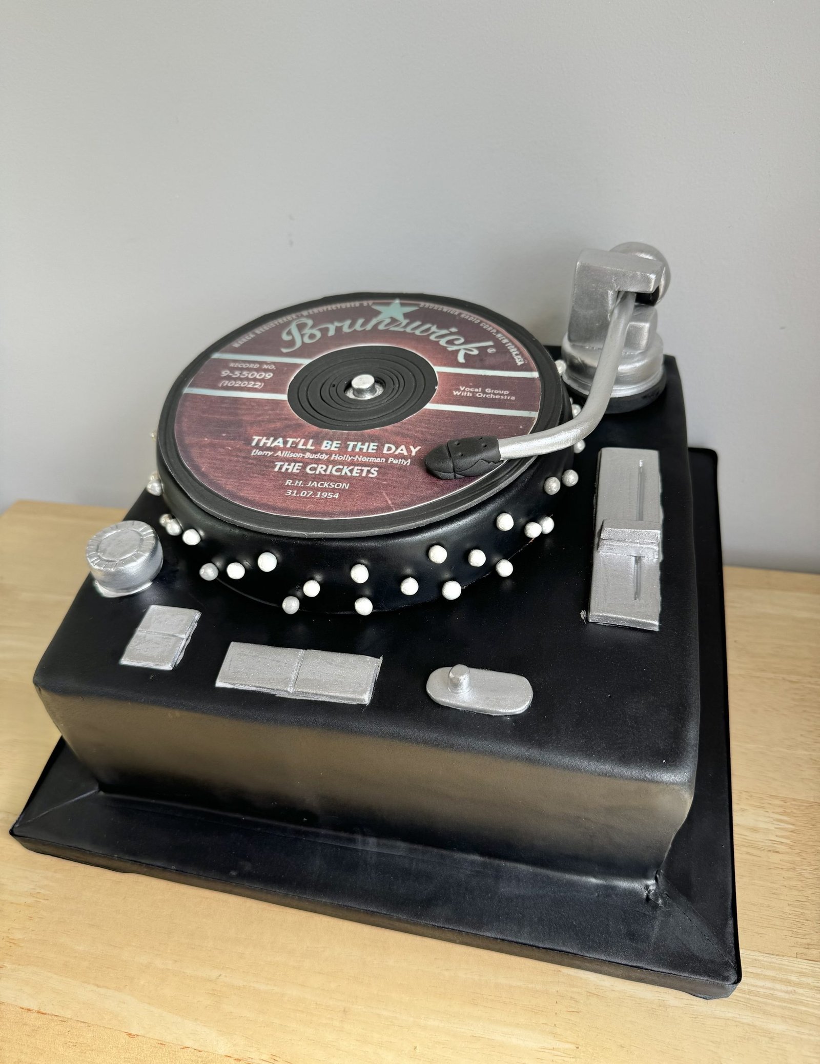 Spin into nostalgia with the Record Player V1, a true showstopper for music lovers and retro enthusiasts! Designed to replicate a classic record player, this cake features a realistic edible vinyl record which can be customised, fondant tonearm, buttons, and dials, all hand-crafted for a lifelike finish. Perfect for music fans and DJs this cake is a unique way to celebrate a birthday or special occasion.