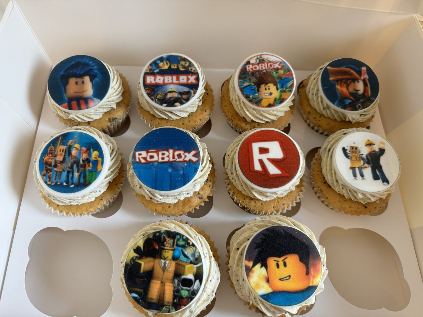 A fun and eye-catching set of Roblox cupcakes, topped with edible image discs featuring popular Roblox characters and logos. Finished with smooth buttercream swirls, these cupcakes are perfect for young gaming fans and make a playful yet polished choice for a Roblox-themed birthday celebration, designed to impress straight out of the box.