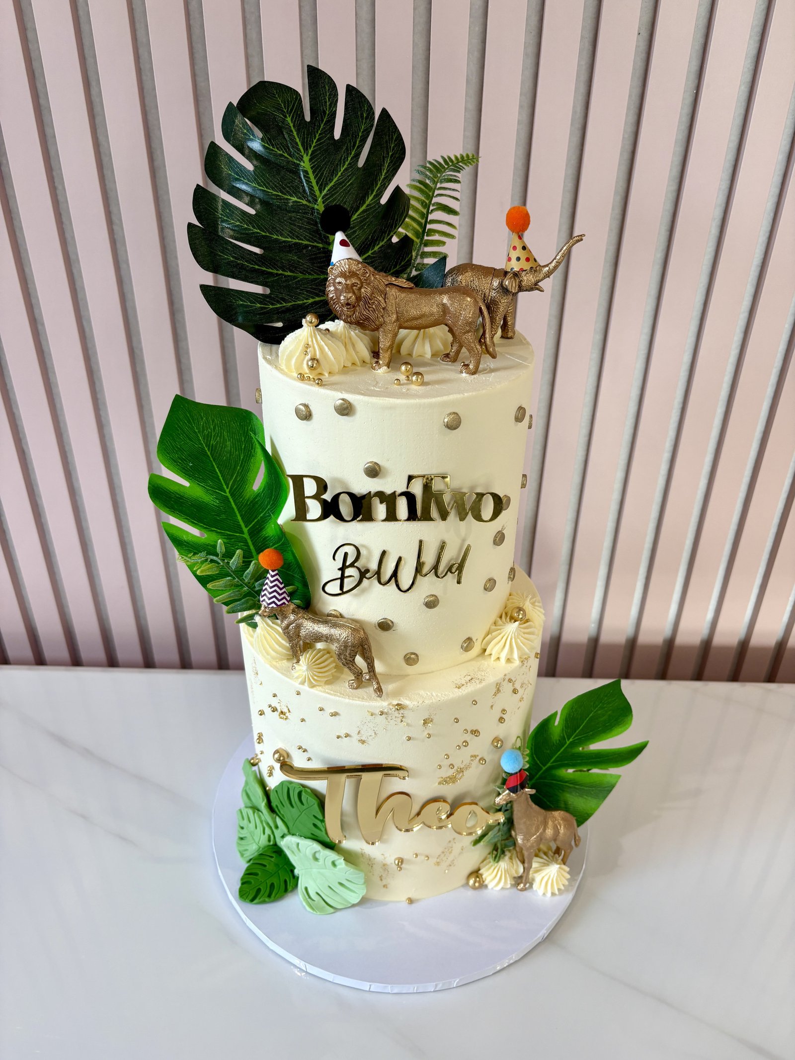 A striking two-tier safari cake designed in smooth ivory buttercream with refined gold detailing and bold jungle foliage accents. Finished with metallic gold safari animal figures, subtle gold leaf touches and statement lettering, this design blends modern luxury with playful adventure. Perfect for safari-themed birthdays and wild one celebrations, it creates a showstopping centrepiece that feels both elegant and fun for boys and girls alike.