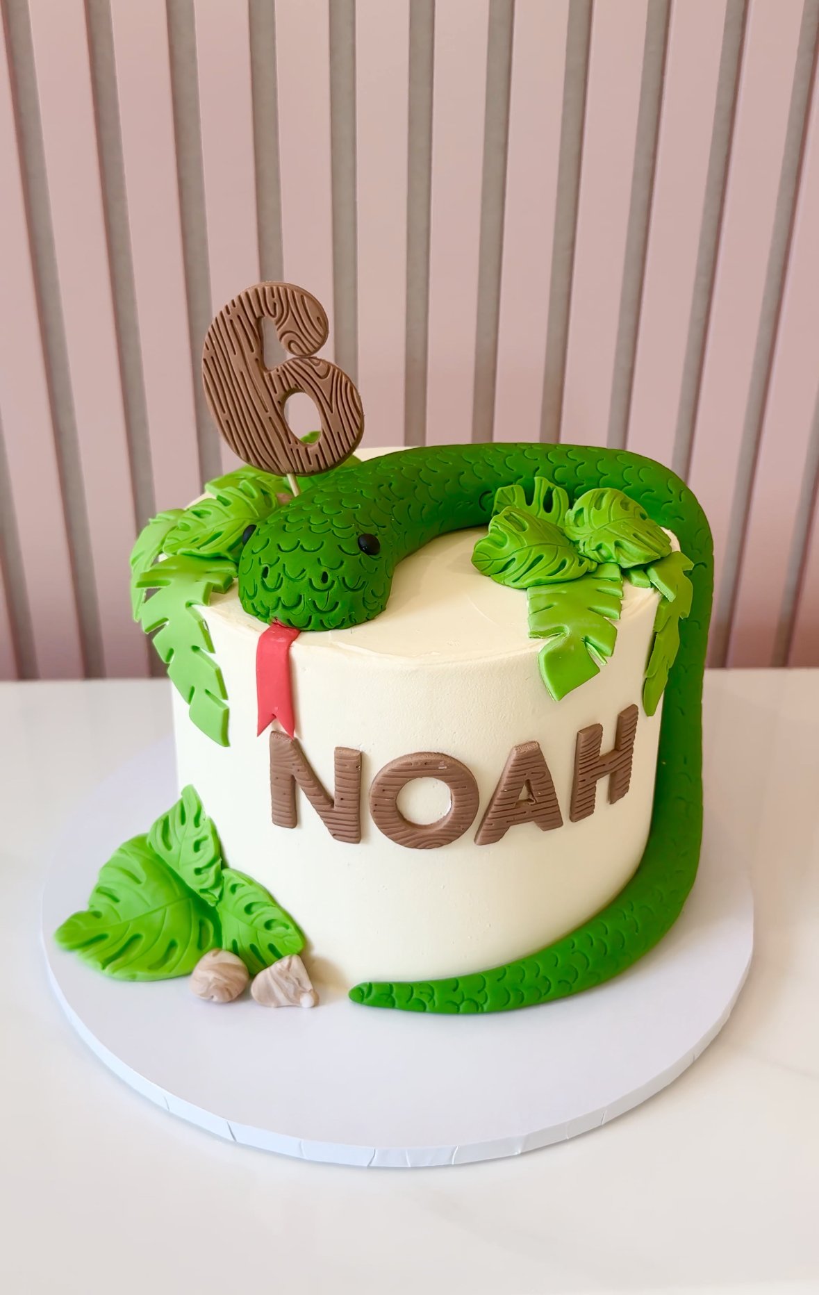 Perfect for little explorers, this jungle-inspired cake features a handcrafted green snake curled around the top, leafy foliage, and a textured wood-effect name and number. It’s a bold and fun design that’s sure to slither its way into the spotlight at any birthday celebration.
