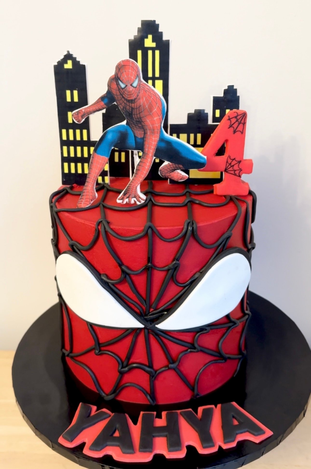 Swing into action with our Spider-Man Cake V1, perfect for any web-slinging fan! This bold red and black cake features an intricate web design with striking white eyes, capturing the essence of the iconic superhero. A dynamic city skyline backdrop and character topper bring the theme to life, making this cake an unforgettable centrepiece for any birthday celebration.