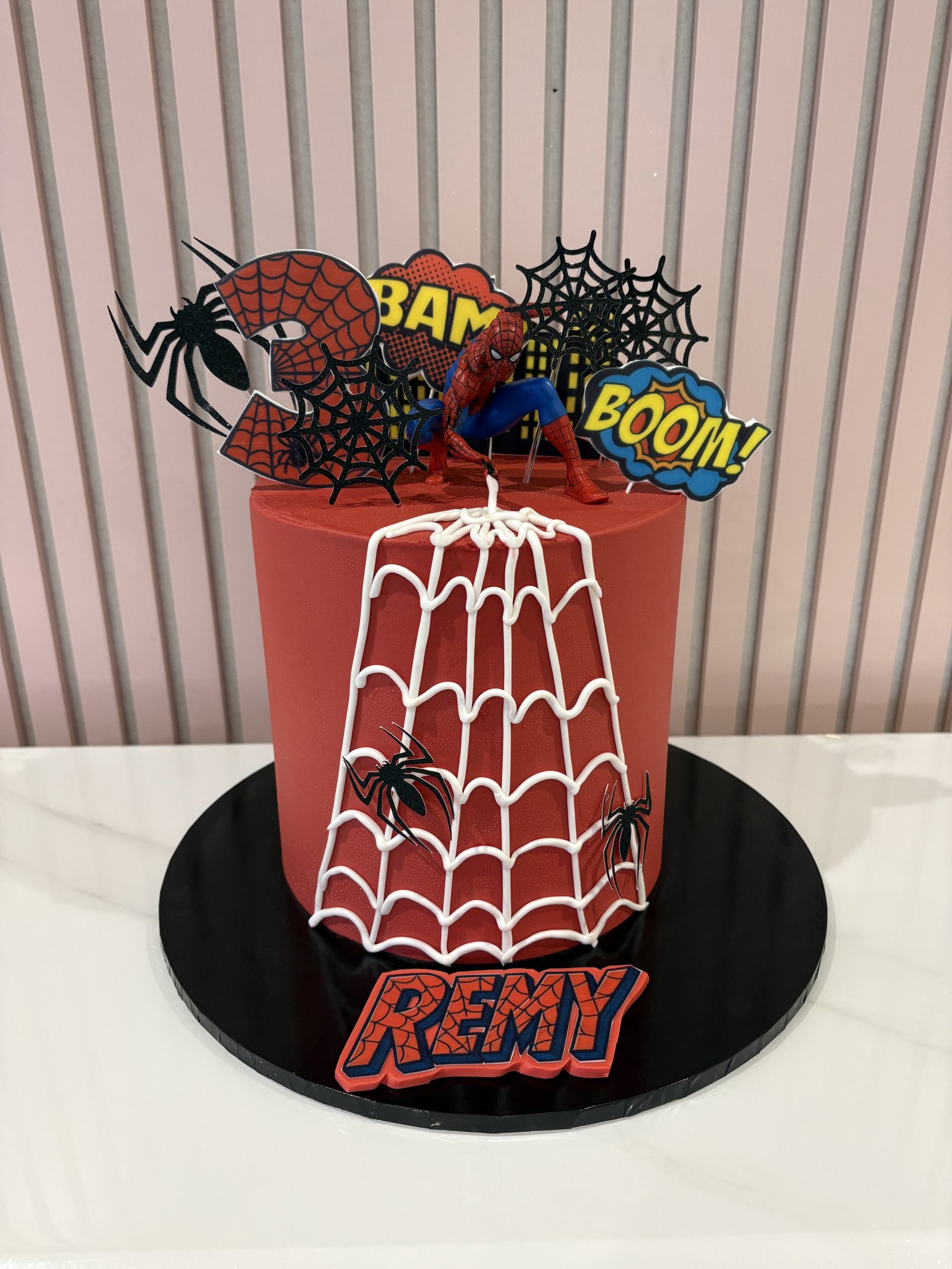 A bold and action-packed Spider-Man design, finished in smooth red buttercream with an eye-catching white web cascading down the front. Topped with dynamic comic-style elements including city skyline details, “Bam!” and “Boom!” signs, and a striking Spider-Man figure, this cake captures the energy of a true superhero moment. Black spider accents and layered web toppers add depth and drama, while the clean cylindrical finish keeps the overall look modern and refined. A powerful choice for little heroes who love adventure and iconic comic style.