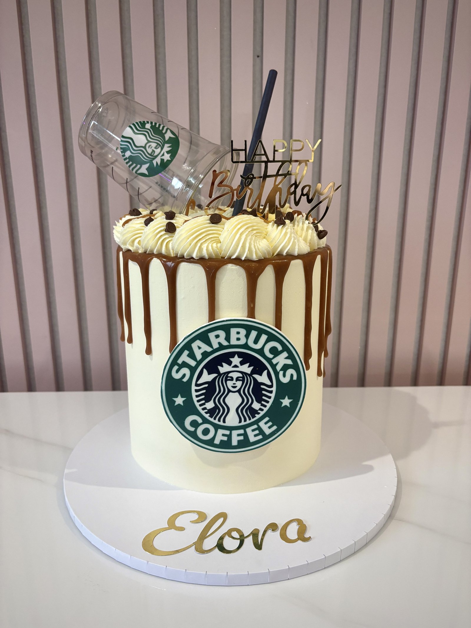 This coffee-inspired cake is designed with a clean, modern finish and a gravity-style effect, featuring a Starbucks cup topper pouring into the cake below. Finished with smooth buttercream, a rich drip effect, and piped detailing on top, the design is both stylish and playful. A bold logo plaque and personalised name complete the look, making it a standout centrepiece for a coffee lover.