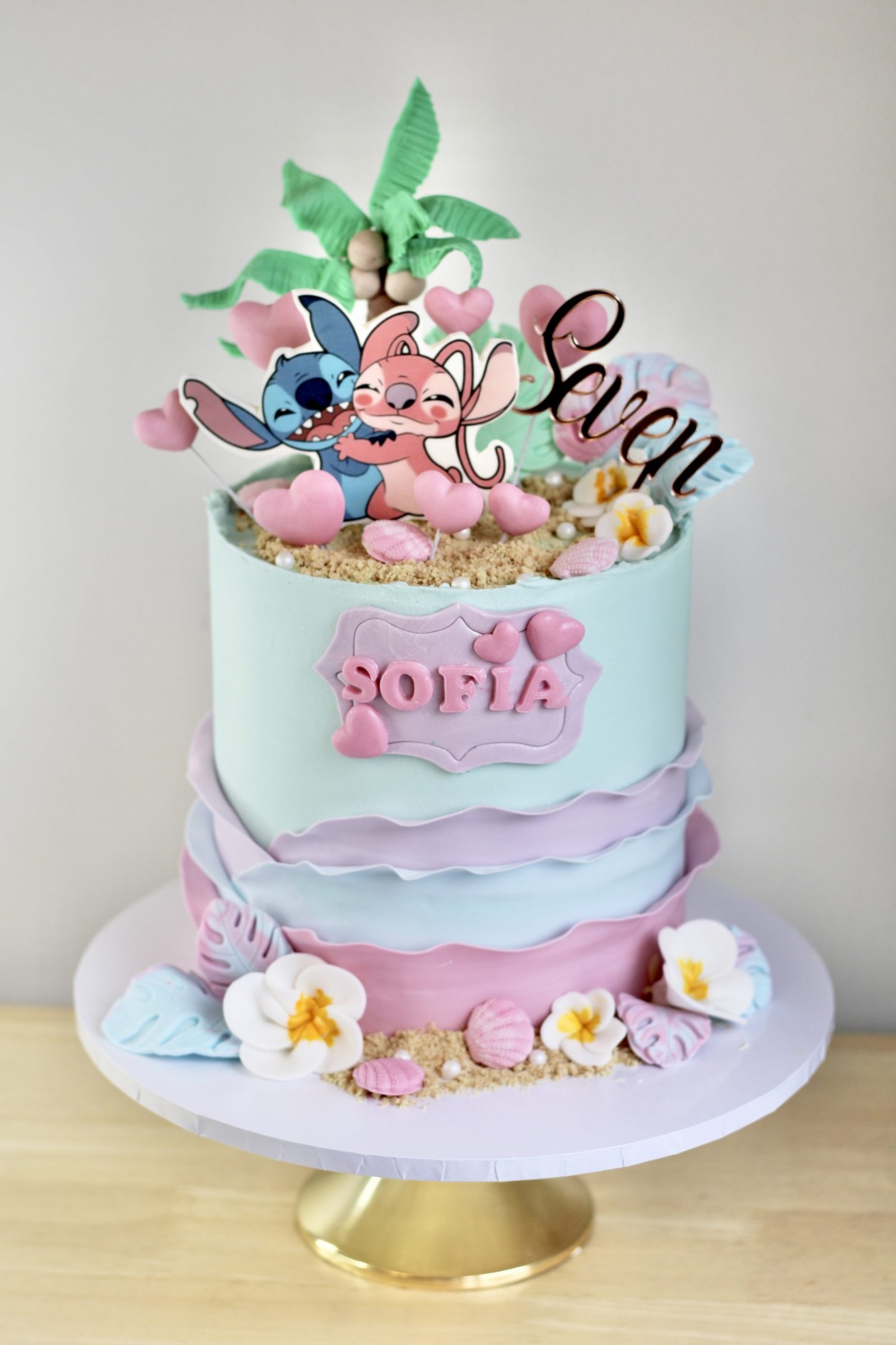 Bring the magic of a tropical paradise to your celebration with this beautifully designed Stitch Cake! Featuring soft pastel shades of blue, pink, and lilac, this cake captures the essence of an island escape. The top is decorated with a sugar sand beach, delicate seashells, tropical flowers, and palm trees, creating a fun, beachy vibe. Adorable edible prints of Stitch and Angel add a playful touch, making this cake perfect for fans of the beloved characters.