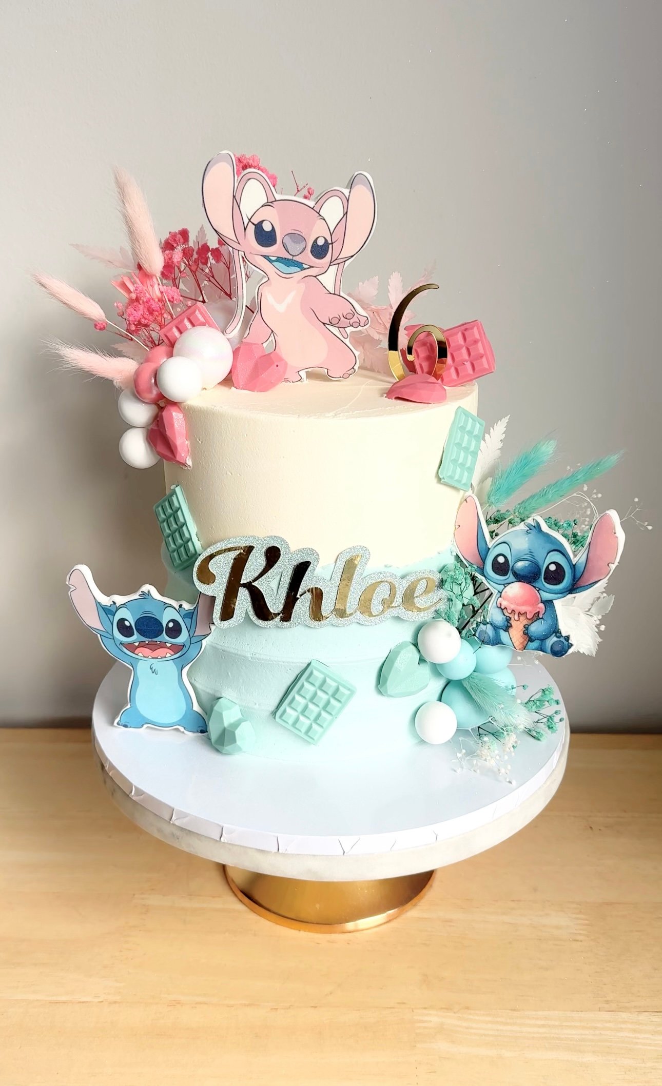A delightful cake for any Stitch and Angel fan! This pastel beauty features soft blue and cream buttercream, adorned with adorable edible decorations of the beloved characters. Topped with a mix of pink and turquoise details, including mini chocolate bars, geometric gems, and fluffy dried florals, this cake brings tropical charm and a touch of fun to any birthday celebration.