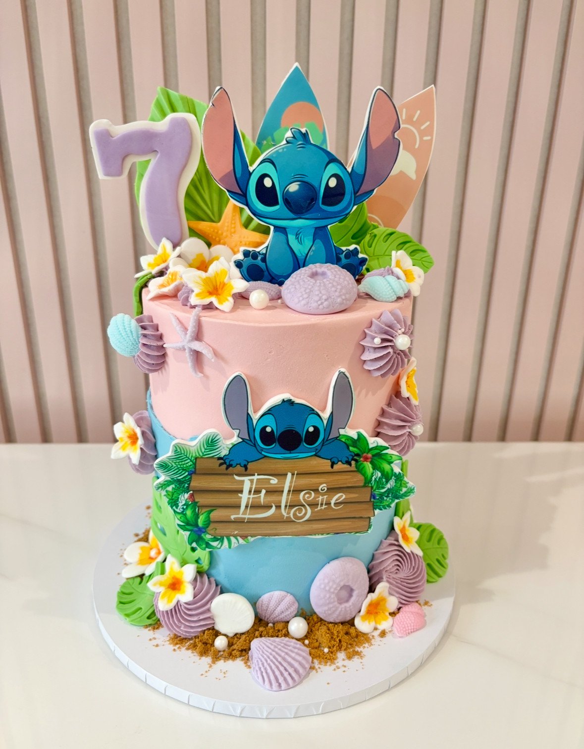 A vibrant tropical Stitch-inspired cake featuring soft pastel buttercream in blush pink and ocean blue, finished with playful island details and colourful character toppers. Decorated with tropical leaves, frangipani flowers, seashell accents and textured buttercream swirls, this design captures a fun Hawaiian beach vibe while keeping a beautifully polished finish. Perfect for a lively birthday celebration, this cake is designed to bring big smiles and an eye-catching centrepiece to the party table.